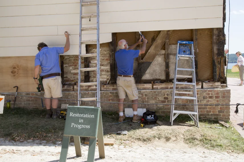 Mount Vernon’s historic preservation team routinely examines the conditions of these structures. While doing so earlier this year, they removed the bottom layers of siding and found significant rot and termite damage. They immediately began to reinforce the structural timbers and repair the damaged siding.