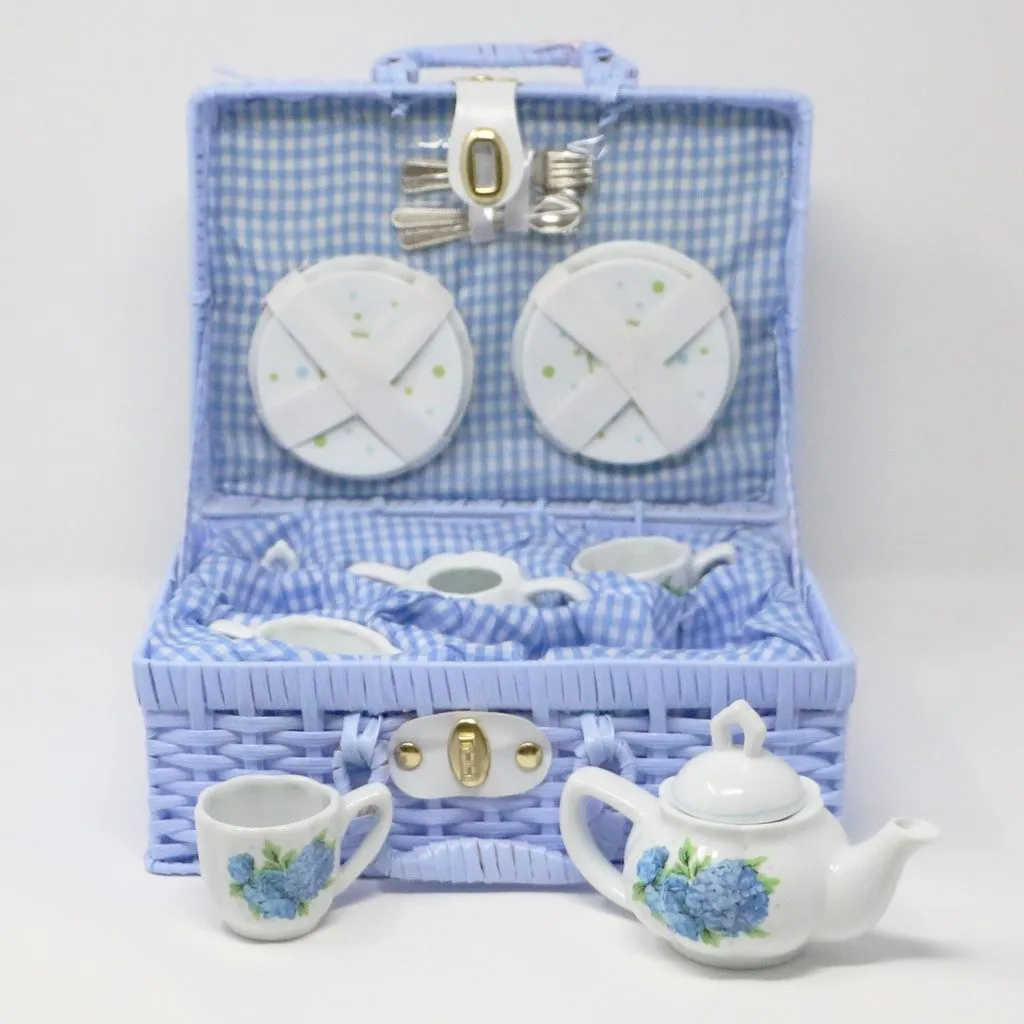Plates are 3 ¾" in diameter; saucers are 3 ½" in diameter; tea cups are 2" tall. The rectangular basket is 8" x 10" x 3". Ages 5 and up.