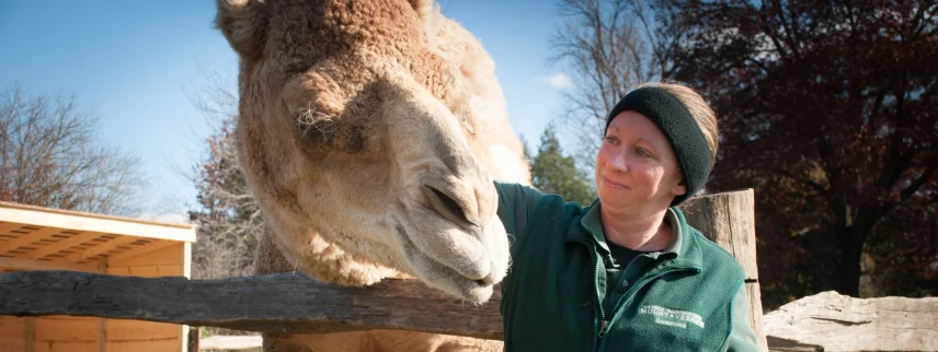 When Aladdin hears the familiar hum of the engine and tires rolling across the gravel path, the 7 foot tall camel stands and hurries to the fence. Having stayed at Mount Vernon every holiday season since he was eleven months old, the camel knows the approaching vehicle is bringing him food. Lisa Pregent (above) is a member of the Mount Vernon li...