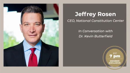 Every Monday, we'll be hosting a special livestream just for our Mount Vernon members! On Monday, September 14, National Constitution Center President & CEO Jeffery Rosen joins Washington Library Executive Director Kevin Butterfield in advance of Constitution Day. They will reflect on the world-altering significance of the document's creation in 1787, as well as the National Constitution Center's ongoing efforts to educate the public today.
