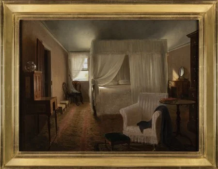 This painting is one of the most significant pieces of evidence in determining the appearance of the Washington bedchamber in the last year of George Washington’s life. Alexandria born artist John Gadsby Chapman visited Mount Vernon and sketched the empty room long after its original contents had been dispersed. He then traveled to each of Martha’s grandchildren’s homes and sketched the objects they owned from the space. Eleanor “Nelly” Parke Custis Lewis, who grew up at Mount Vernon, instructed the artist on the proper placement of each piece. The artist combined his research to create this evocative scene combining careful research and observation.