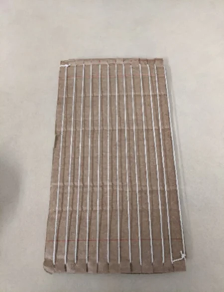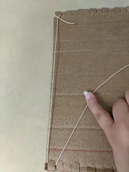 Then bring the twine up to the first slit on the top, around the back, then back down the next slit. Repeat until done. Tie a small knot around the last slit. These vertical threads are called warp threads and is what will hold your weaving together.