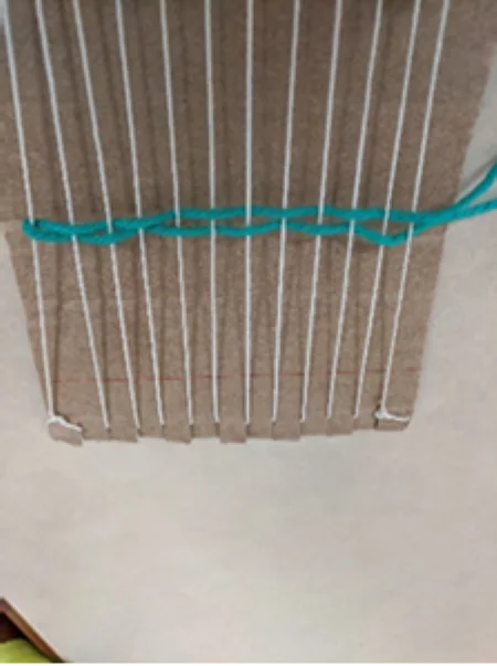 Next take a long piece of yarn to use as your weft threads and weave it over the first warp thread, then under the next warp thread, then over the third. Repeat the same over/under pattern for all of the warp threads.