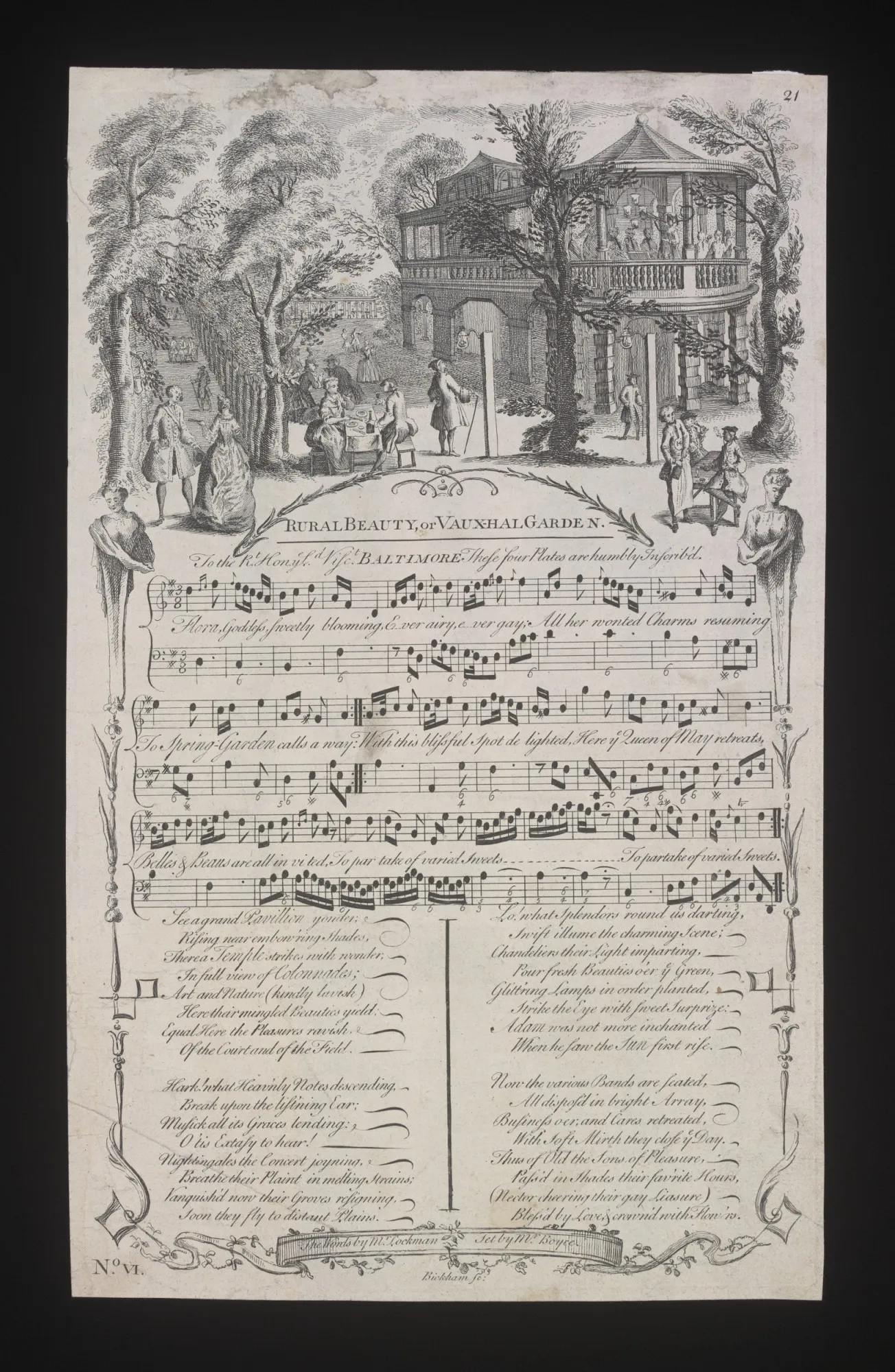 18th -century music sheet, engraved by George Bickham. London, England. Steel engraving on paper. The Gabrielle Enthoven Collection, The Victoria & Albert Museum, London.