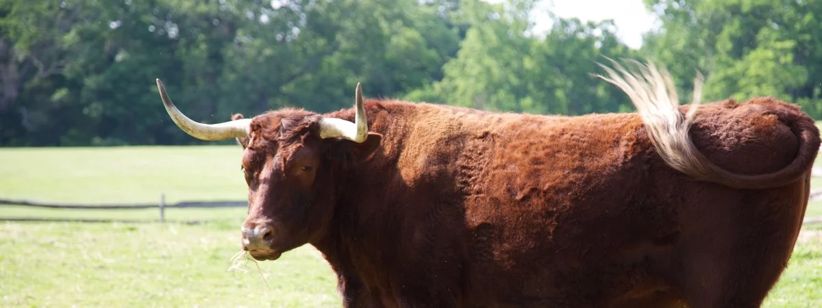 Surviving records tell us that Washington had at least 166 head of cattle at Mount Vernon in 1765, so Devons played vital roles in Washington's plans for animal husbandry. Today, the estate is home to eight Devons, including Quincy, the lone bull in the group. There are also three cows, two heifers, and a pair of hardworking oxen.