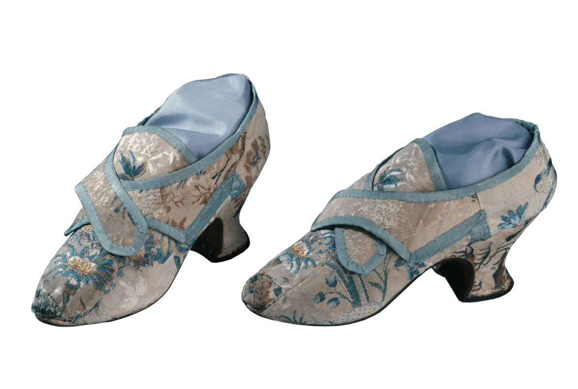 Brocaded silk slipper with leather heel, ca. 1770s. Image (c) The Colonial Williamsburg Foundation.
