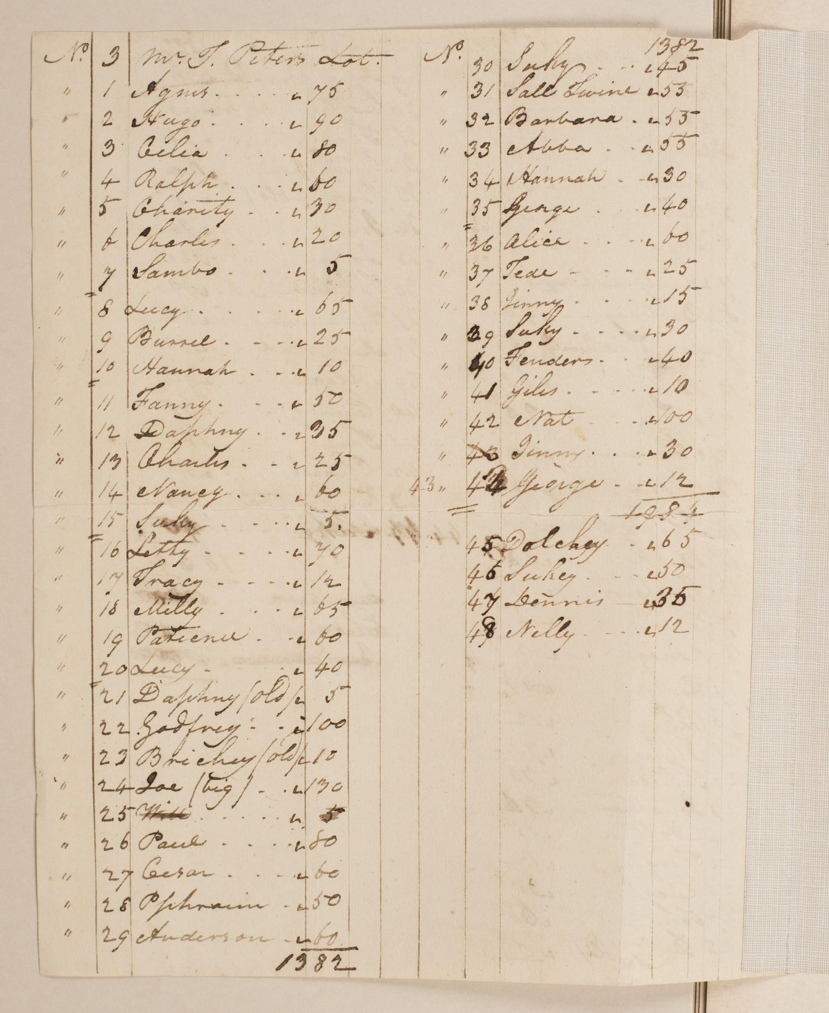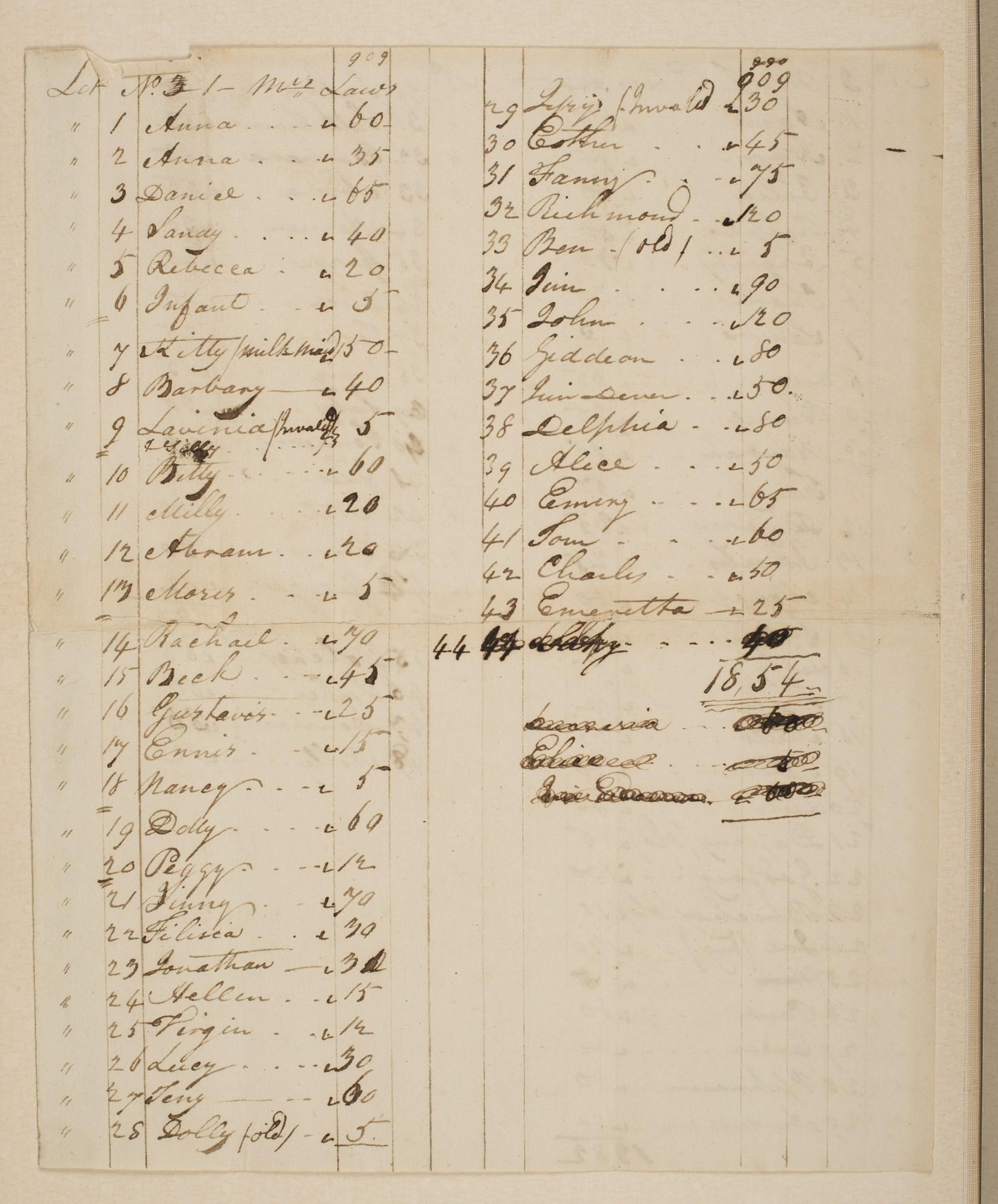 When Martha Washington died in 1802, her grandchildren inherited property in the form of land, household objects, and enslaved people. A set of four lists records the division of the Custis slaves among Martha Washington’s three granddaughters and her grandson. Each enslaved person was assigned a monetary value. The strike-throughs and edits suggest this document may be a draft created as the grandchildren divided the enslaved community into four equal lots. The heirs generally kept young children with their mothers, but few families remained intact.