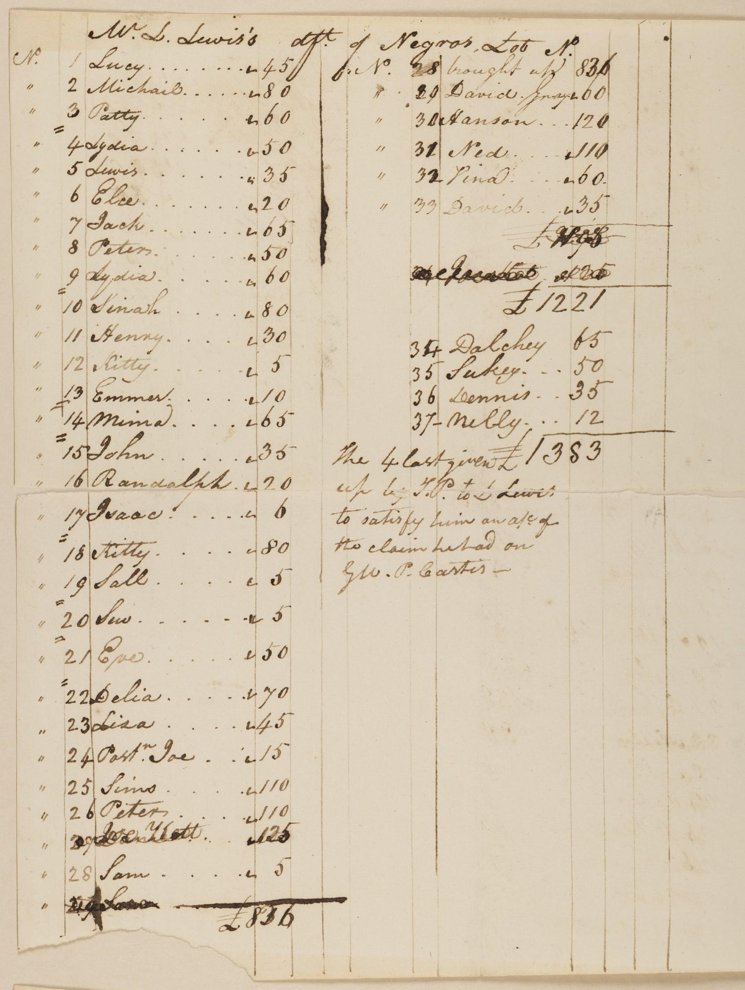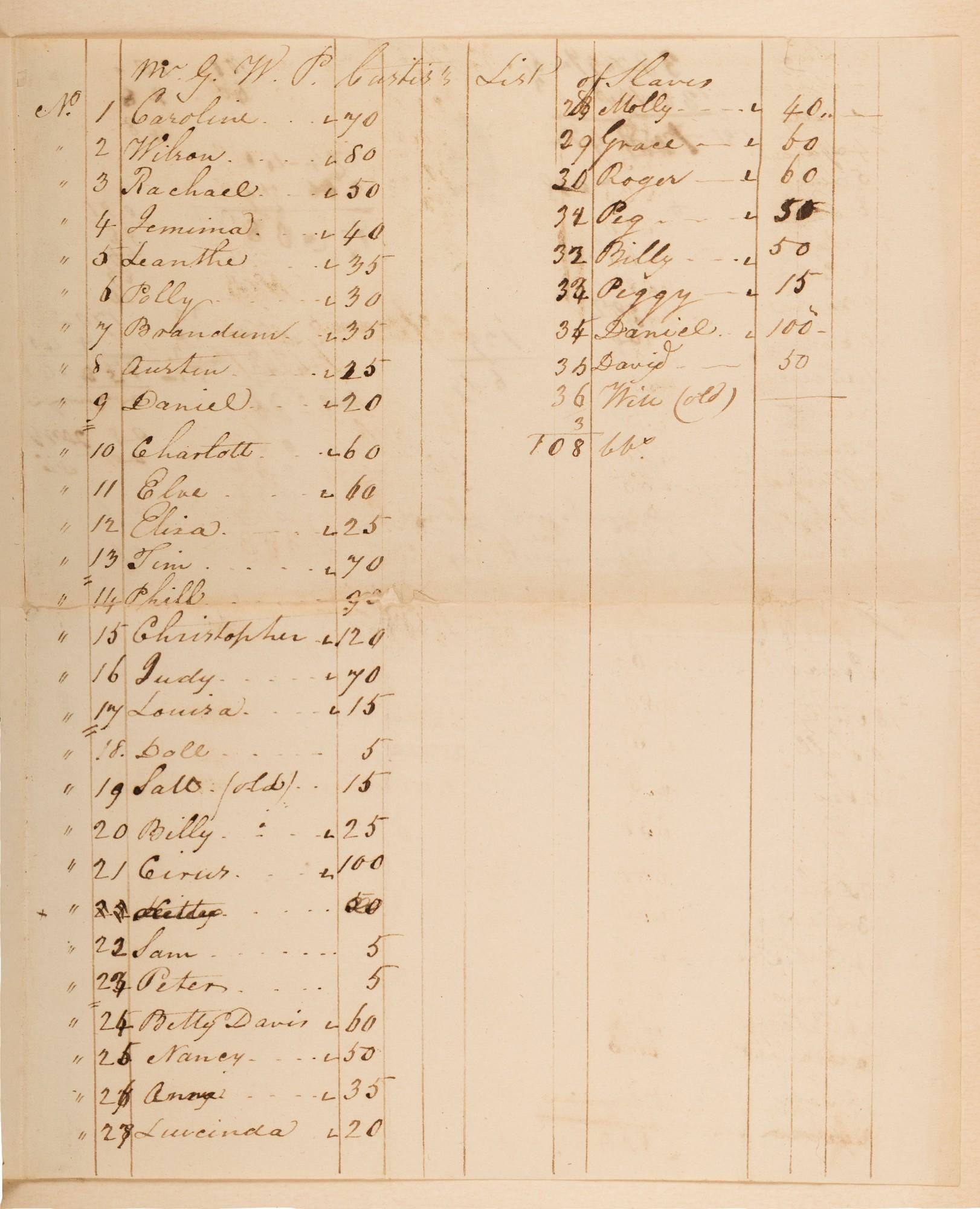 Seventeen-year-old Philip Lee, listed as “Phill” and valued at £90, was the son of Frank Lee, Mount Vernon’s butler, and Lucy, the cook. He was the only member of his family to be inherited by George Washington Parke Custis. At Arlington House, Lee was assigned to be Custis’s valet, a position his uncle William Lee had held for George Washington.