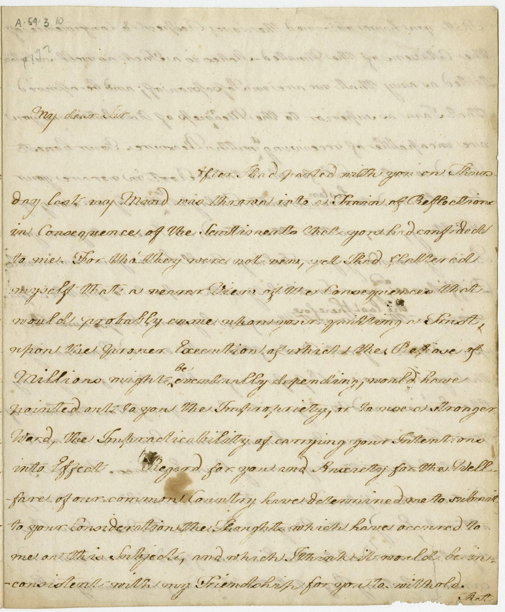 Since Washington was running unopposed, Powel believed that his resignation would be injurious to the order of society. In response to their latest conversation, she decided the best way to convey the sheer “impropriety … or the Impracticability of carrying his Intentions into Effect” was to write a letter. Powel filled it with strongly worded “sentiments that would be inconsistent to their friendship to withhold.”