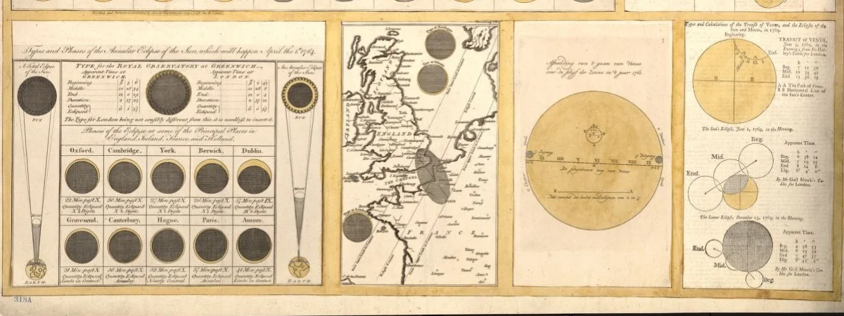 Even during the darkest days of the American Revolution, while war raged across the countryside, people looked skyward and documented sudden darkenings of the heavens. 18th-century almanacs, like the one depicted here, frequently charted these phenomena, and even prominently featured information about them on their covers. As George Washington discovered, information about eclipses could even be valuable to the war effort.