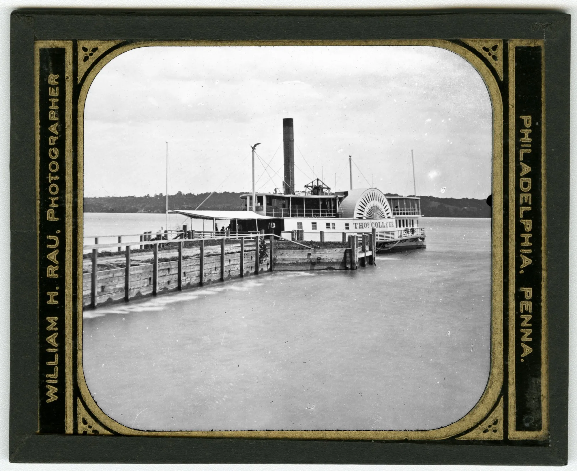 A magic glass lantern slide of the Thos. Collyer passenger steamboat docked at the Mount Vernon landing. The view shows a newly constructed wharf completed by the Mount Vernon Ladies' Association in 1860.