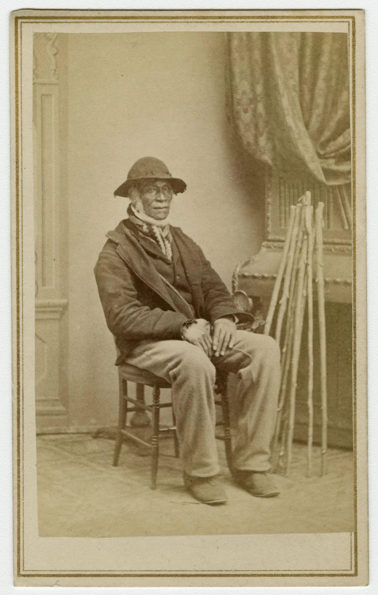 This is a rare 1870 carte de visite of Jim Mitchell, who was born into slavery in 1795. He likely came to Mount Vernon in the 1830s or 1840s with other slaves from Blakeley, another plantation owned by the Washington family, where he worked as a field laborer. The canes beside him hearkened back to souvenirs—often canes—made from wood taken from trees growing near the Washingtons’ tomb and sold to tourists accompanied by stories of the estate during Washington’s time.