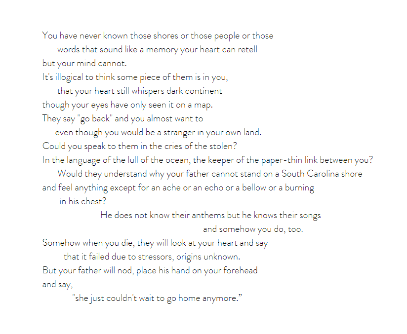 Oral histories suggest that the bodies of the enslaved peoples buried at the Slave Memorial were placed with their feet towards the east and the river, symbolizing their desire to return to Africa. Write about what parts of you will always pay tribute to ‘home.'