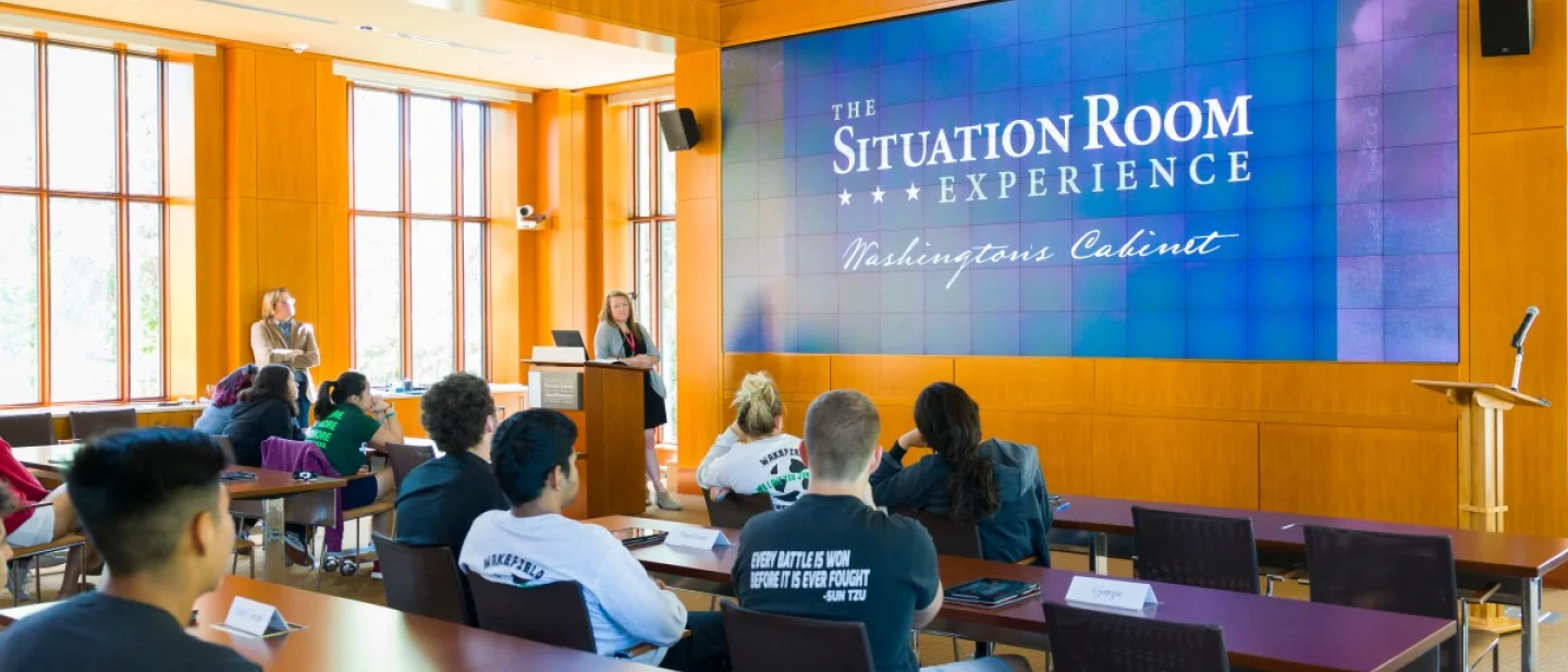 Set in 18th-century America, the Situation Room Experience is a fast-paced and interactive game. It allows participants to step into the shoes of the presidential Cabinet, U.S. senators, foreign ambassadors, Native American leaders, members of the press, and even George Washington himself!