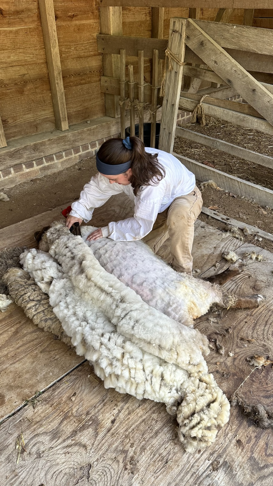 Watch and learn as the livestock staff uses traditional shears to shear the sheep. The fleece is gathered and used in various demonstrations later in the year.