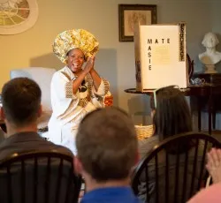 During this program, Brenda Parker serves as the griot, or oral historian, who shares the origins of many songs of the enslaved community and teaches visitors about their daily lives.