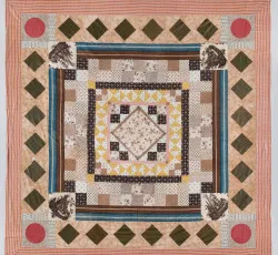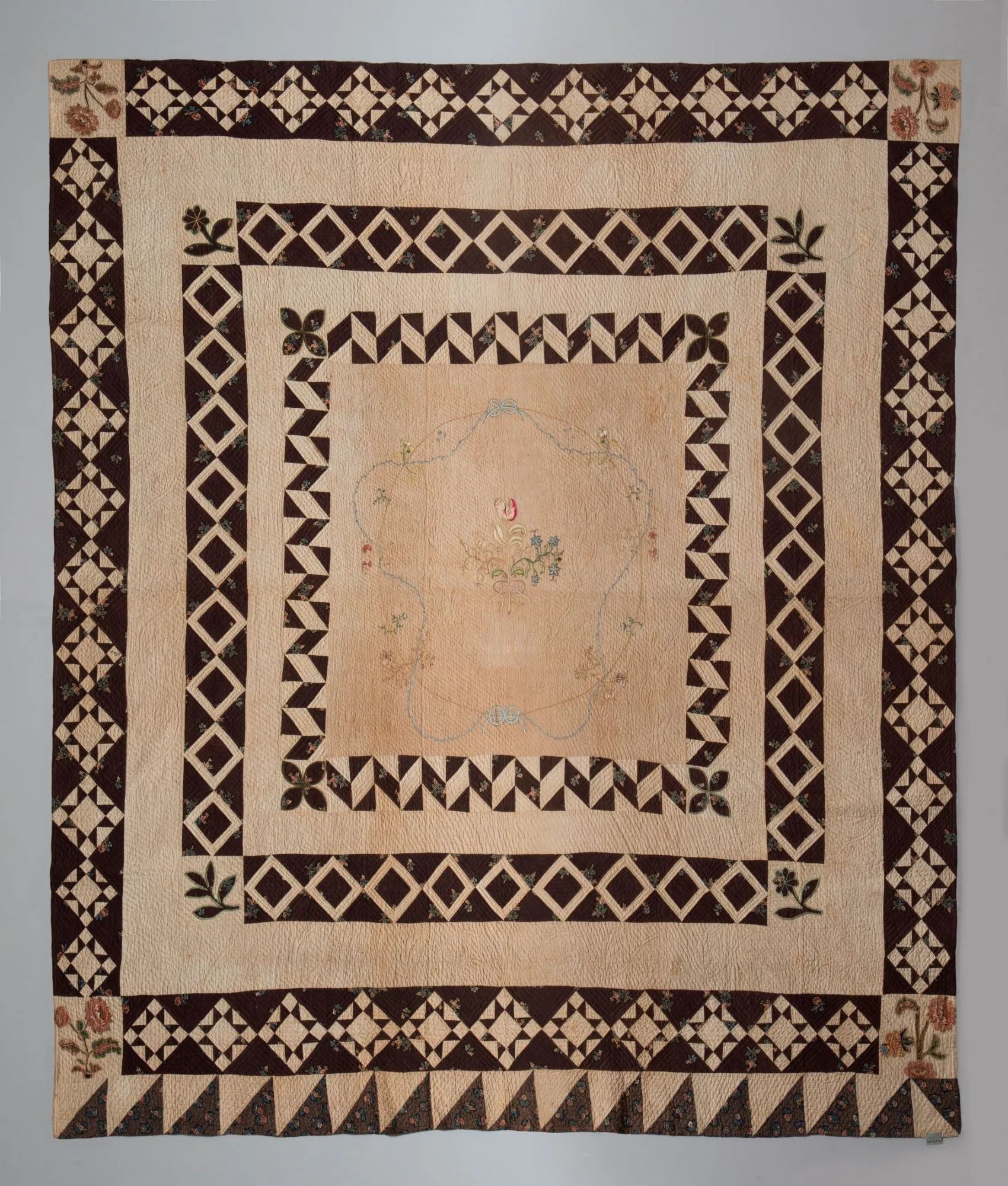 Using a combination of techniques, she created an exceptional display of her needle skills. A silk embroidered bouquet decorates the center while bold geometric borders outline the whole, made from pieced squares of white and dark purple printed cotton. Chintz appliqué or broderie perse designs ornament the corners of the quilt.