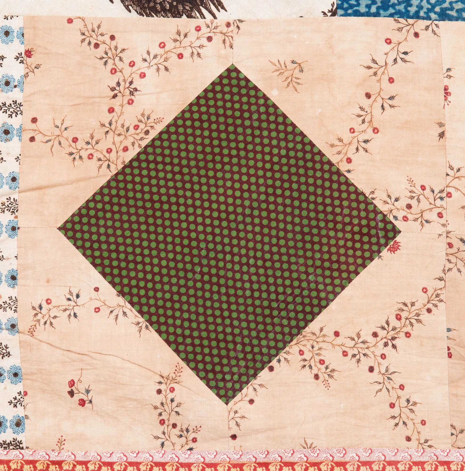 This quilt top is one of three surviving quilt tops pieced by Martha Washington in her late 60s, dating to c. 1800-1802. It was preserved and cared for by Martha Washington’s granddaughter, Eliza Parke Custis Law. The vivid colors and glossy finishes on its printed cottons remain intact more than 200 years later.