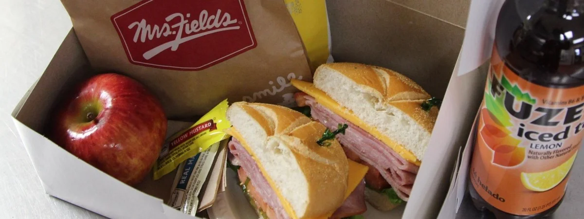 Box lunches include fruit, chips, a cookie, and bottled water or soda.