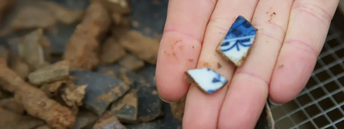 These are fragments of a tin-glazed earthenware punchbowl, with a hand painted botanical band adorning the exterior rim. This ware is often referred to by archaeologists as delftware. The white coloration of the glaze was obtained by adding tin-oxide to a lead glaze. Against this white field, d...
