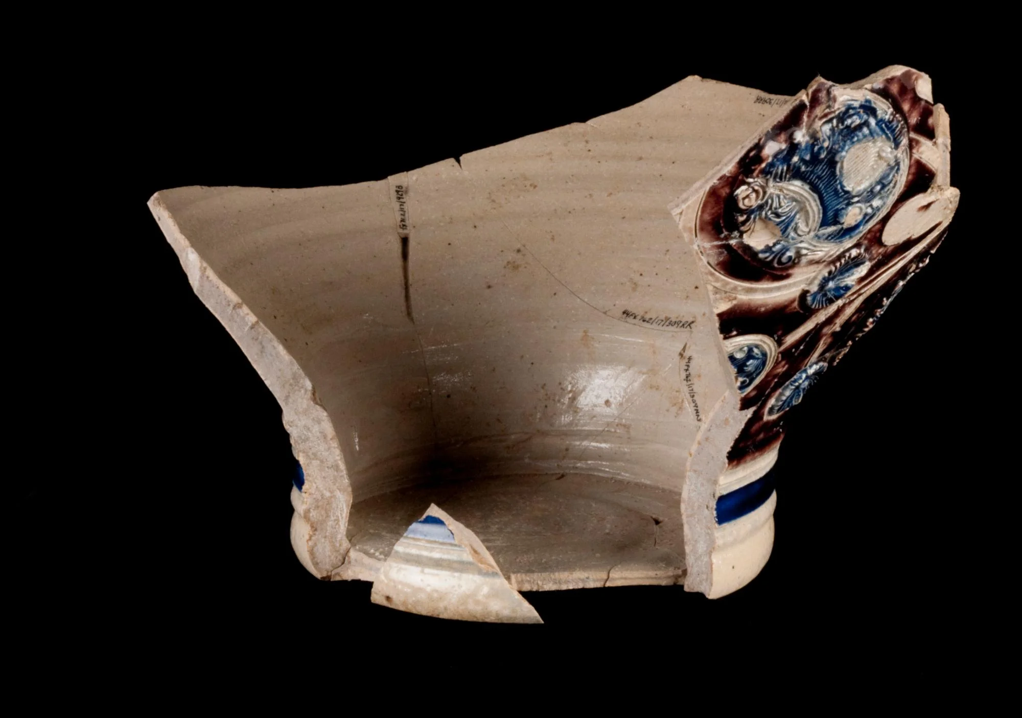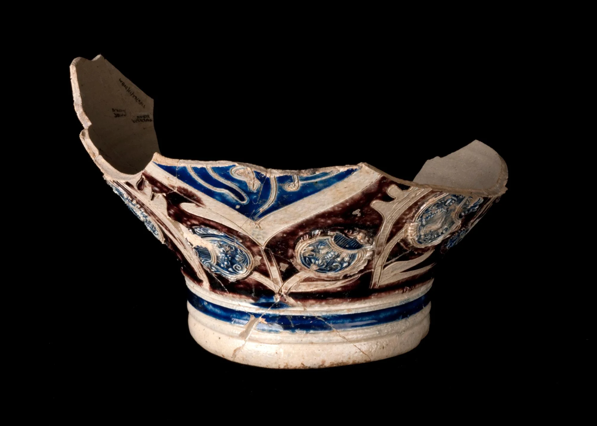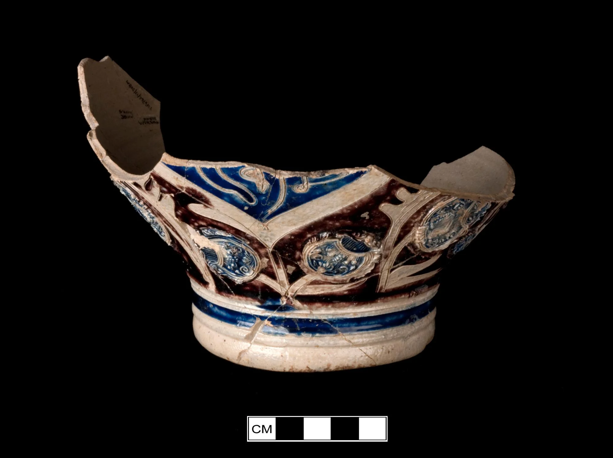 Sprig molded, incised free hand and lathe turned, painted purple and blue.