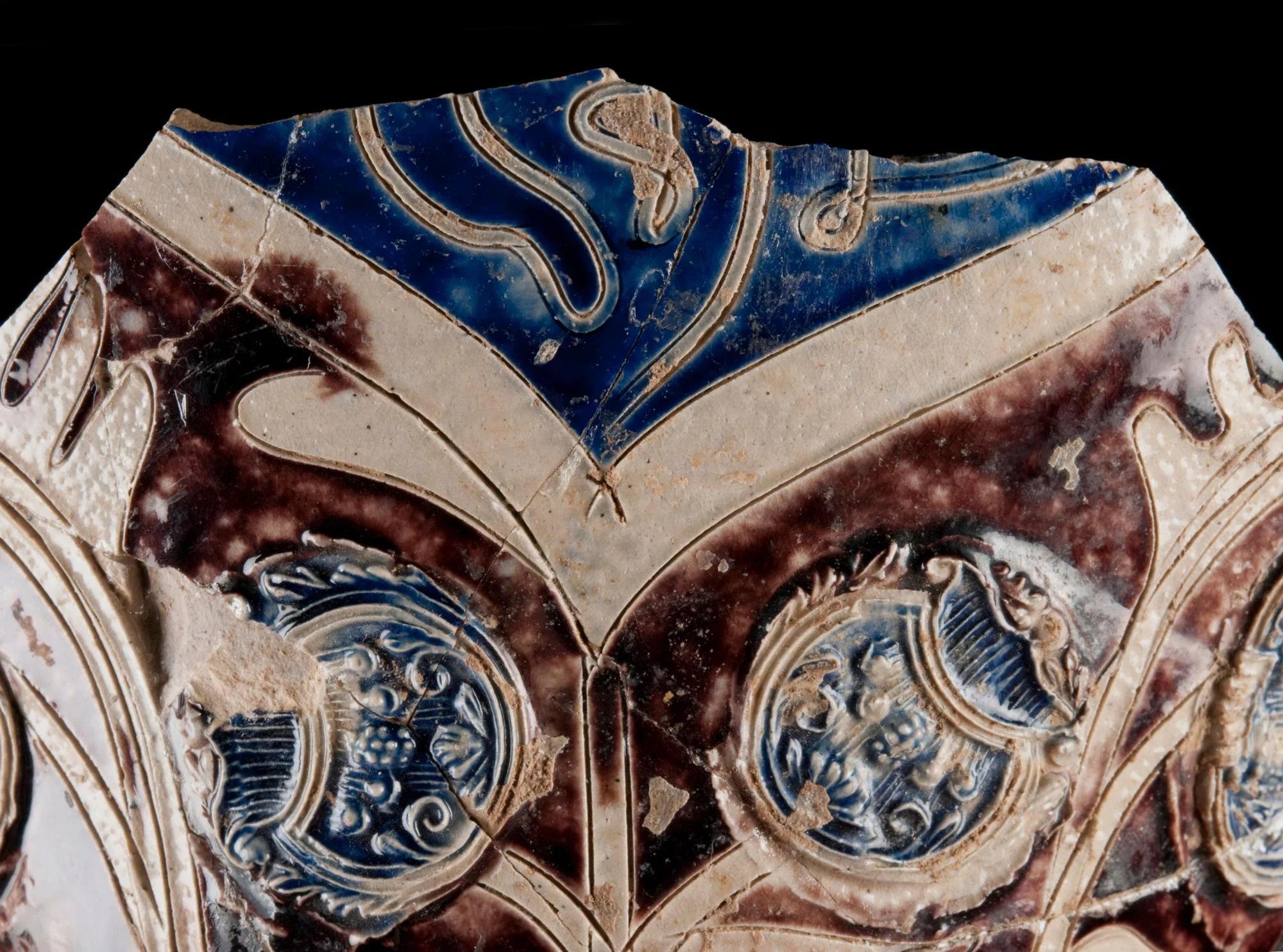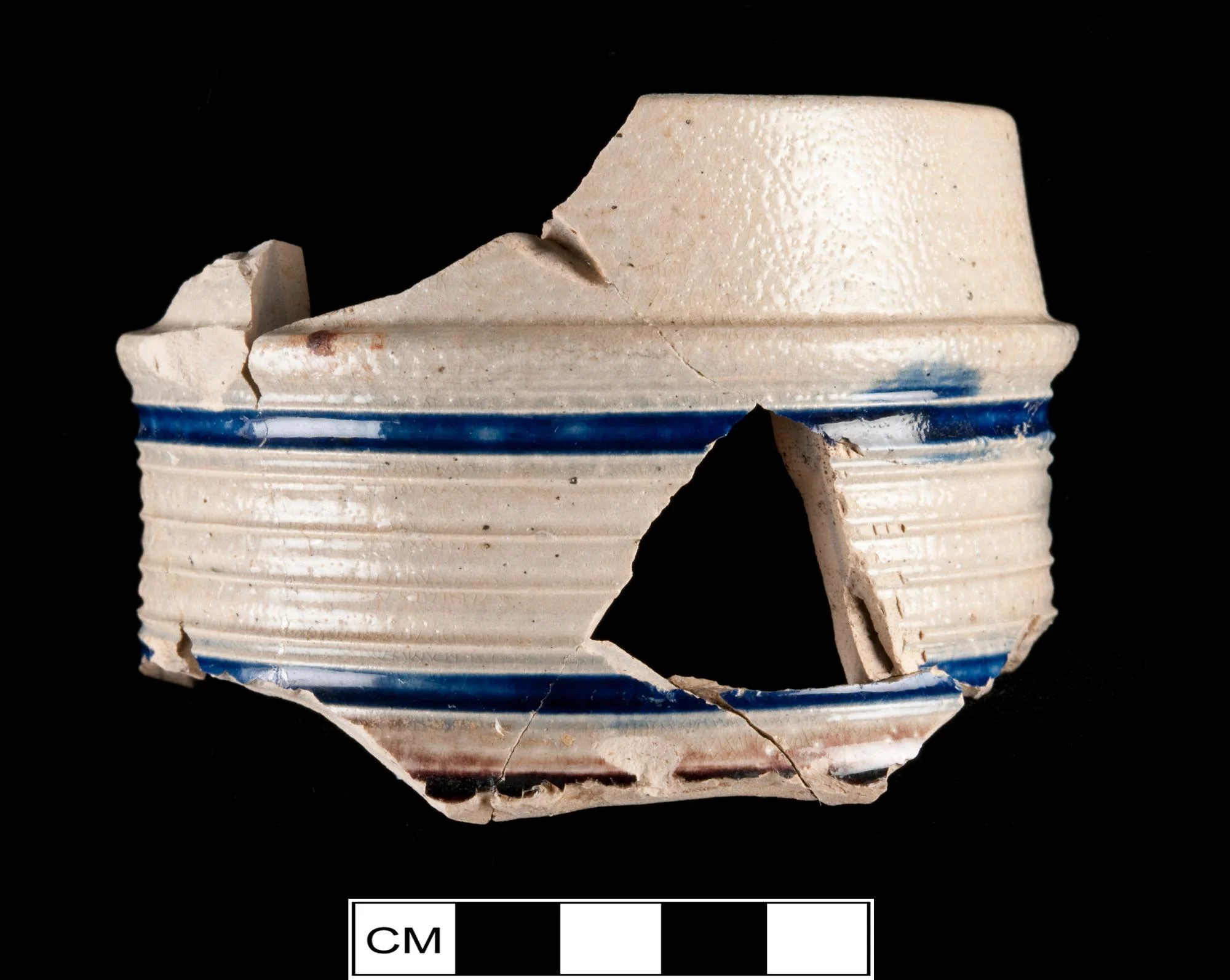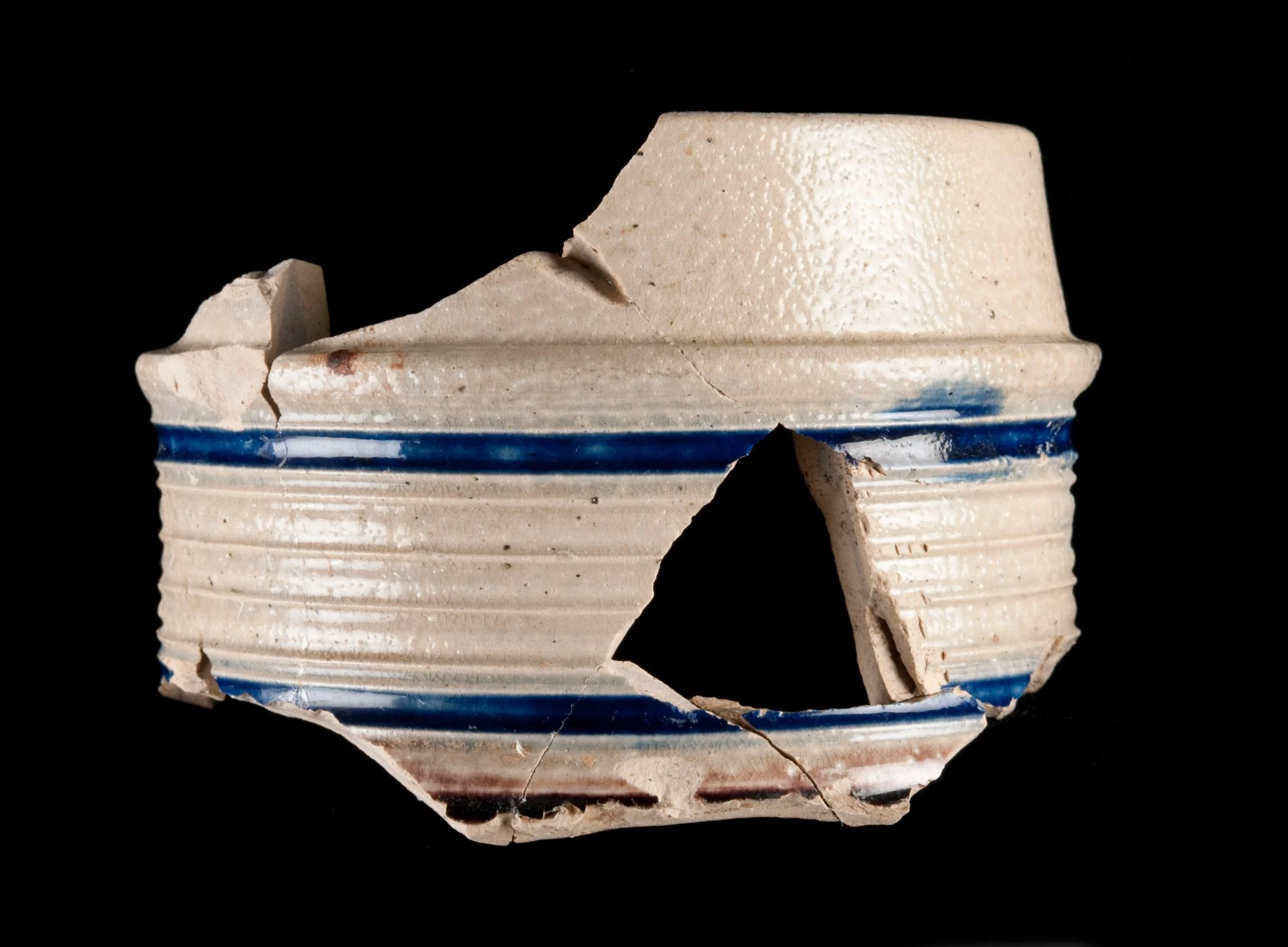 Sprig molded, incised free hand and lathe turned, painted purple and blue.