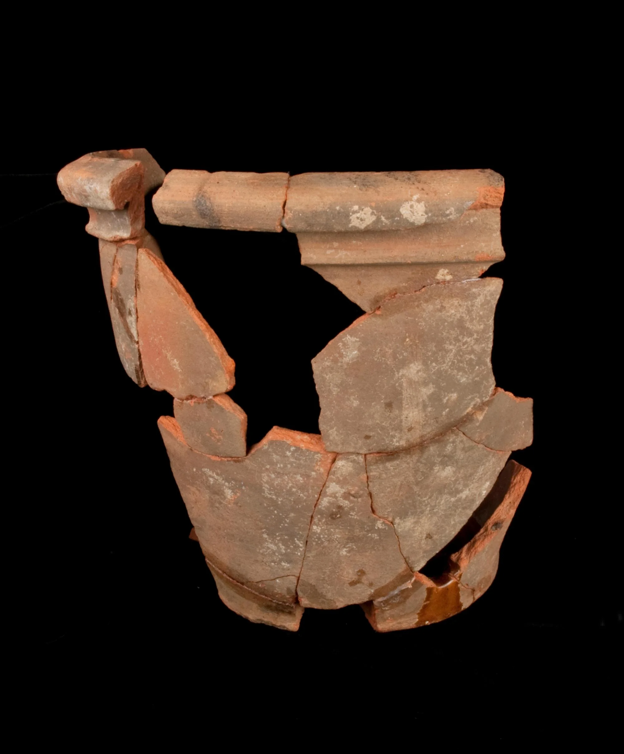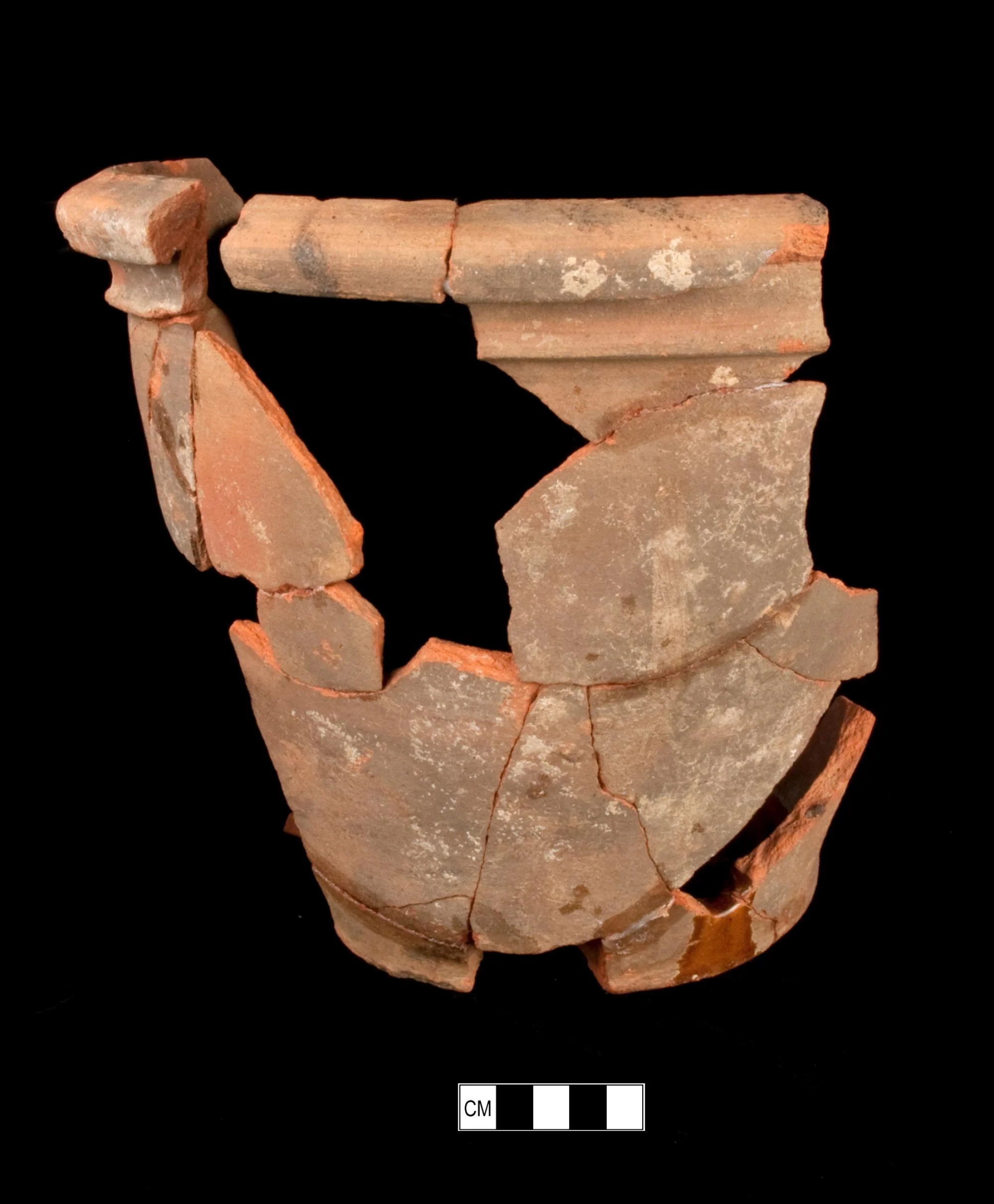 Length and width of largest mended sherd group. One hole in body just above base possibly for spigot. Capacity: 17.06 imperial pints.