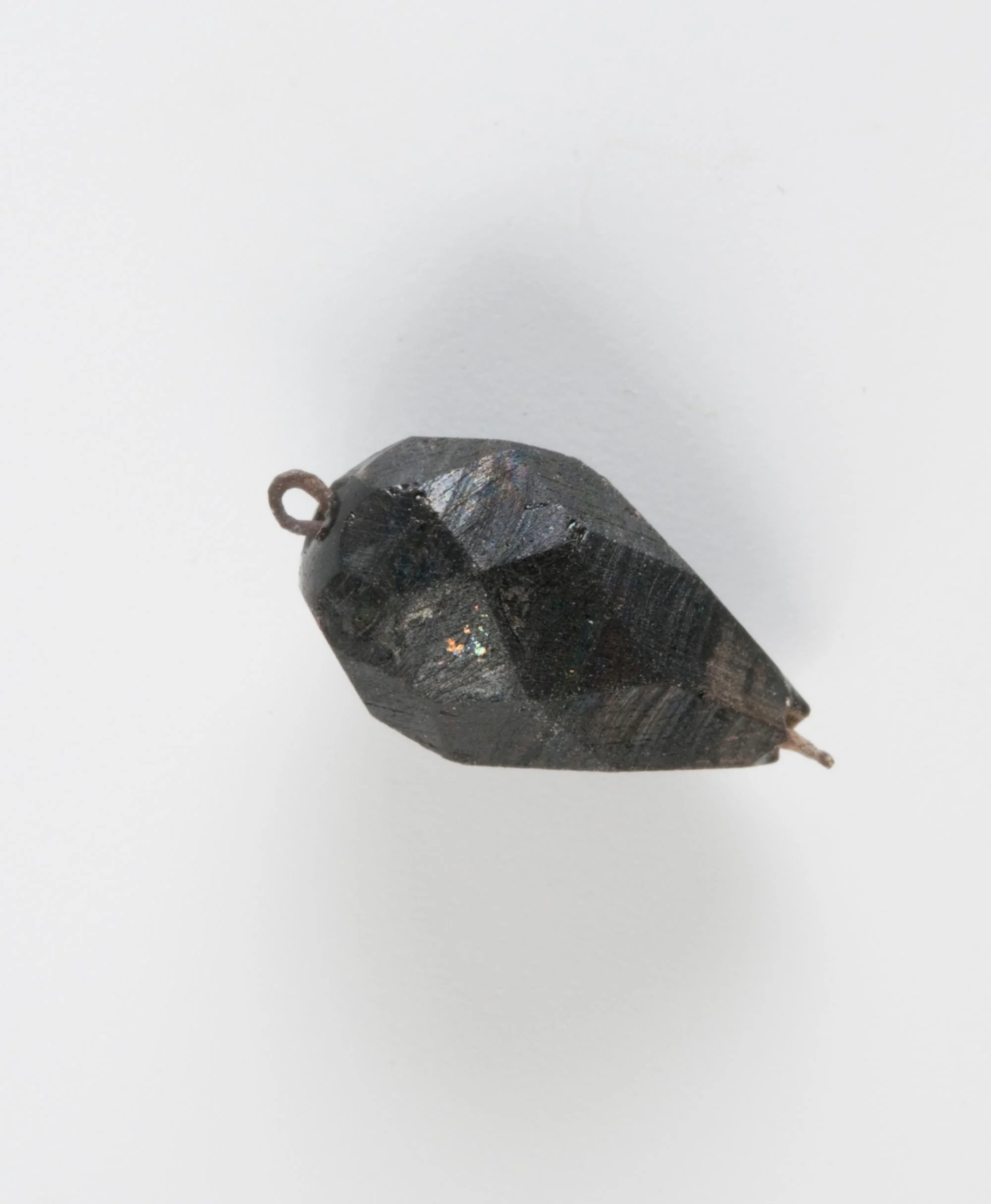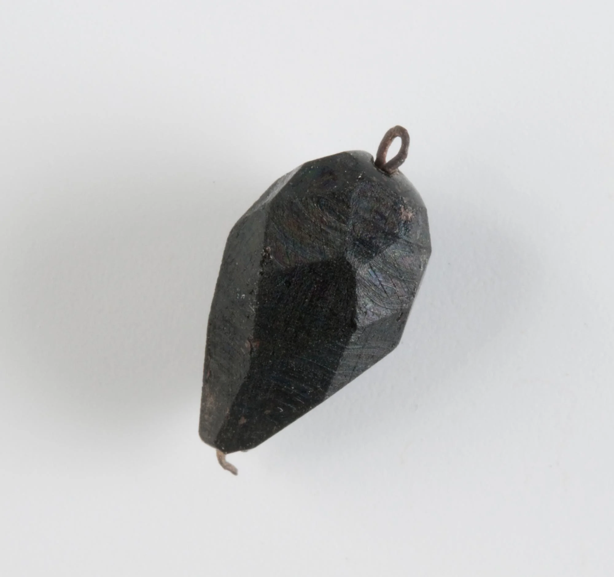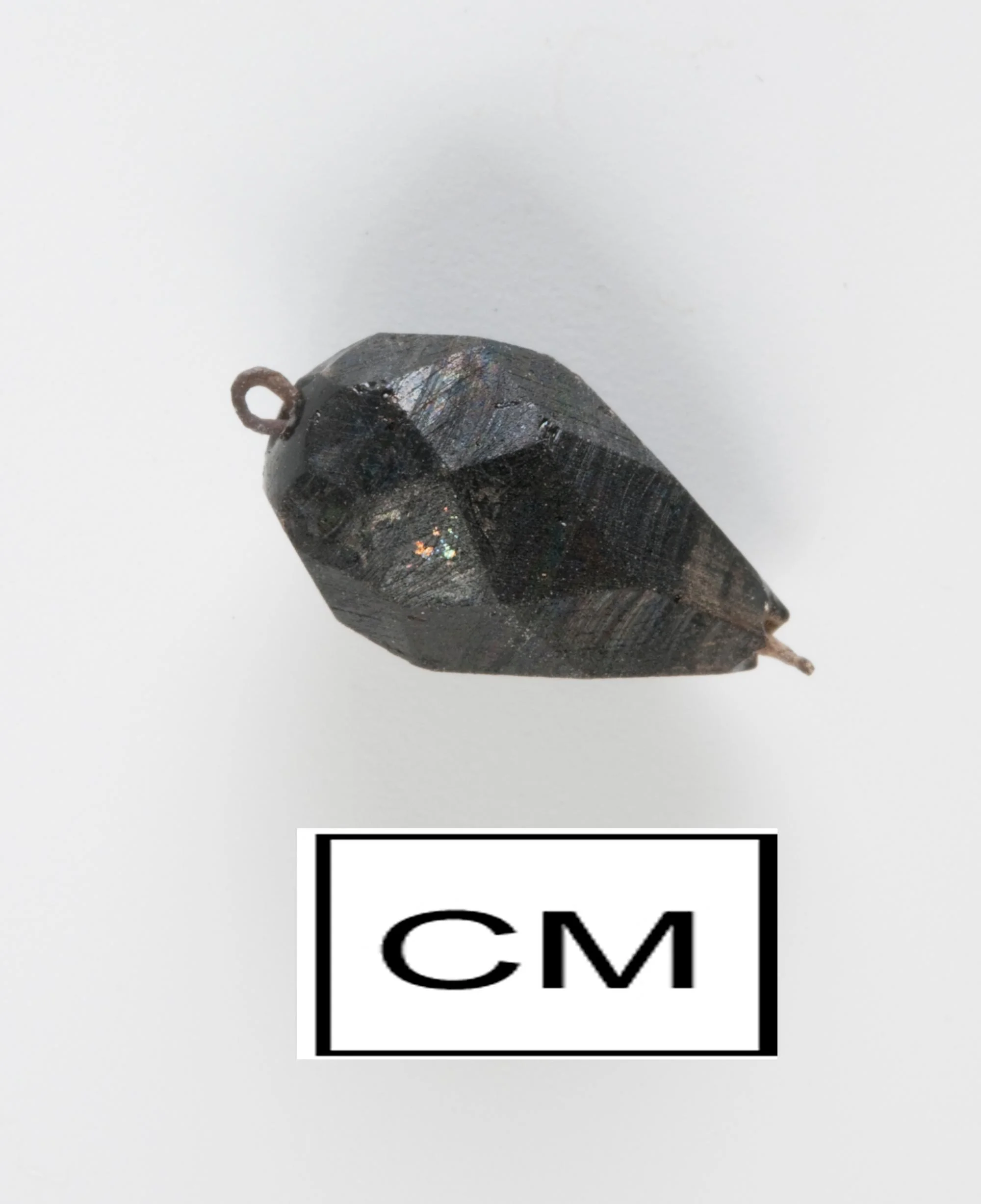 Teardrop shaped paste jewel with copper alloy wire running through the length and terminating in a loop for attachment at one end. Possible watch trinket (White 2006:437) or earring bob.