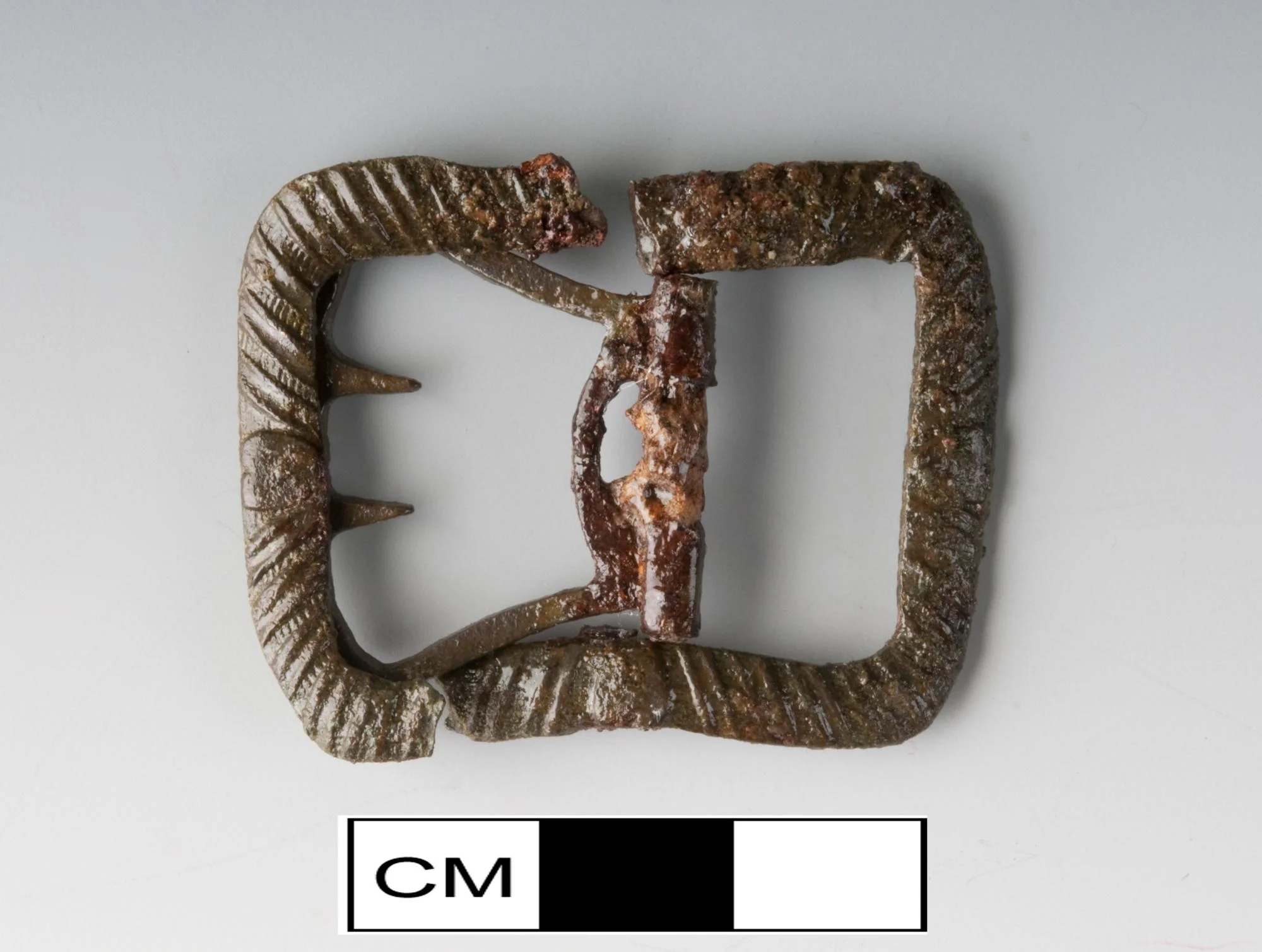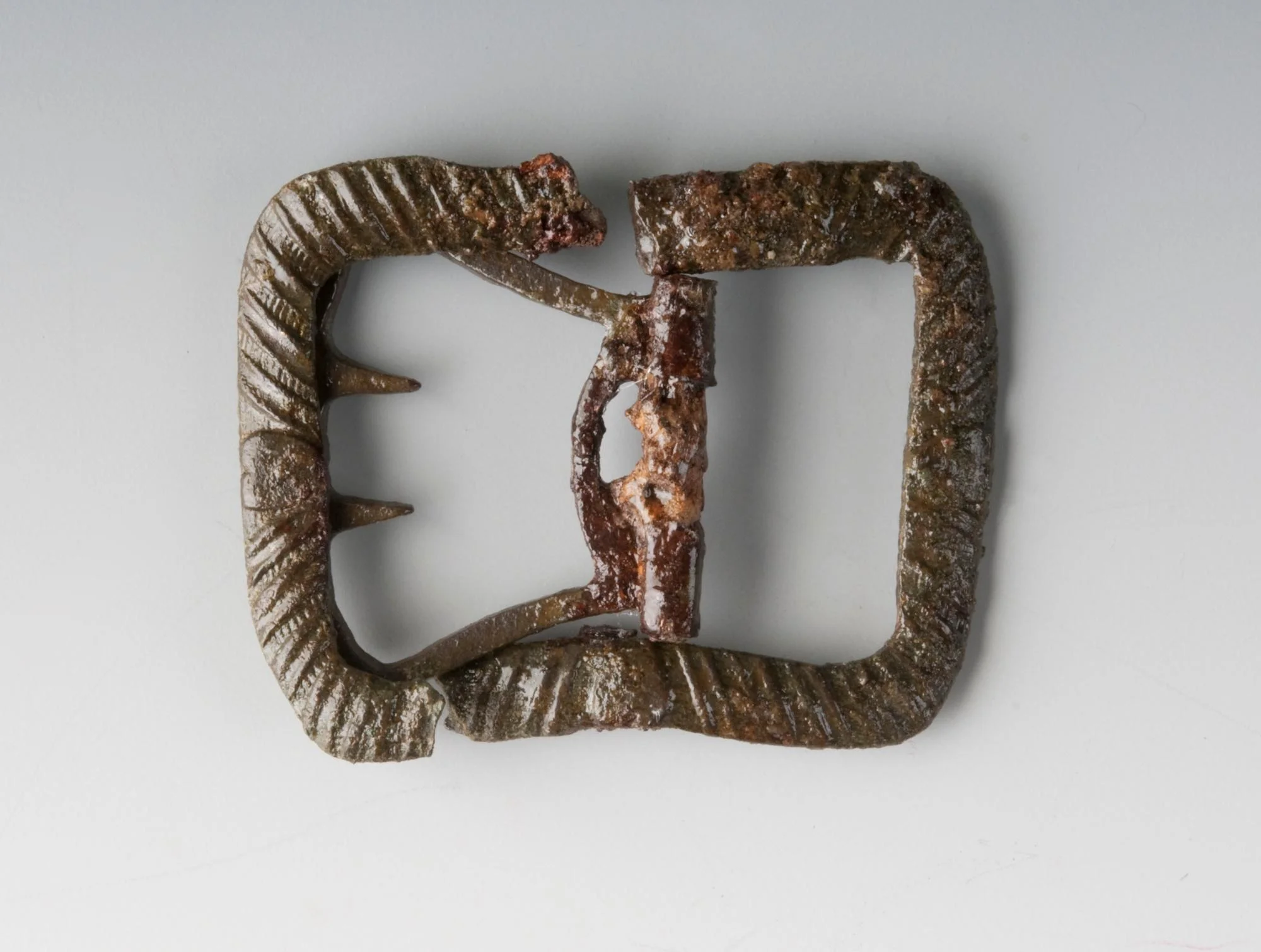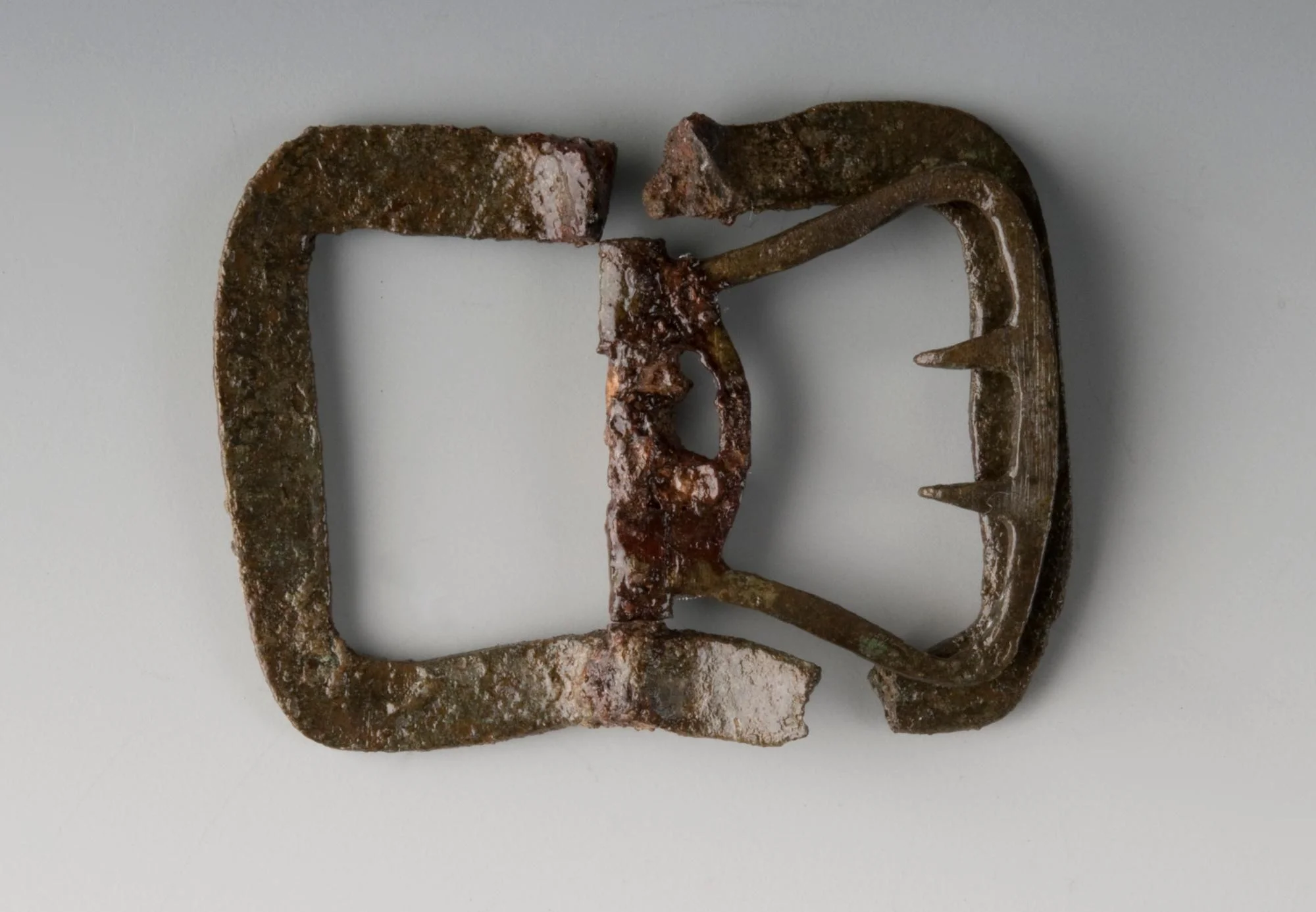 Frame broken nearly in half, hook and pin detached from frame; possible heart-shaped motifs on opposite ends of the frame.