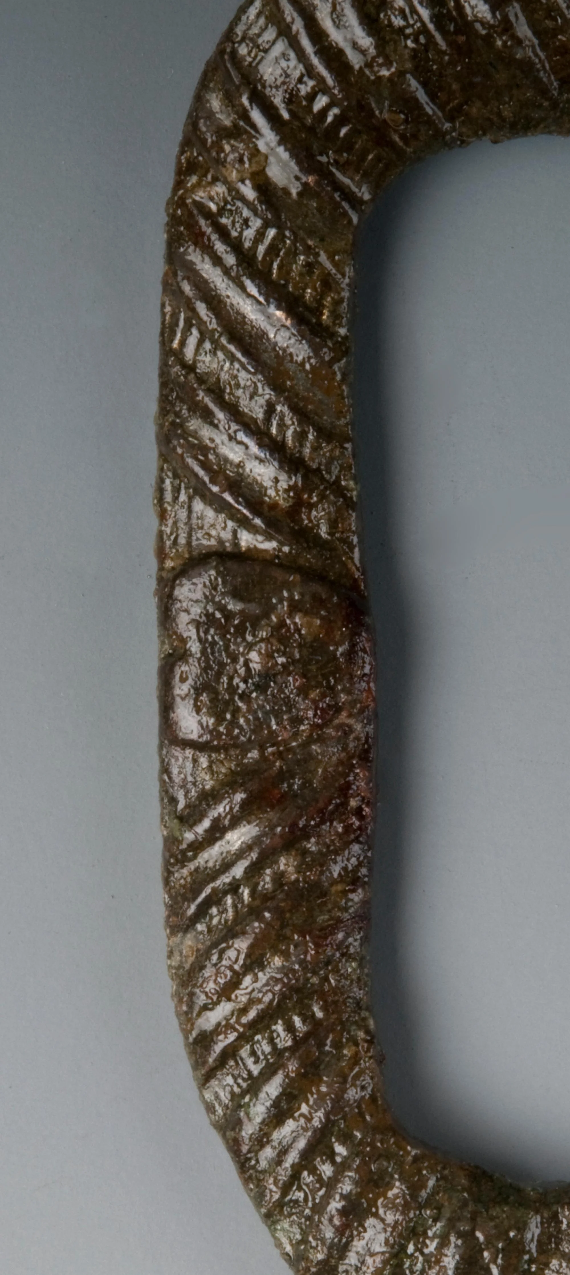 Ornamental grooves with possible heart shaped motifs on either end of the frame.