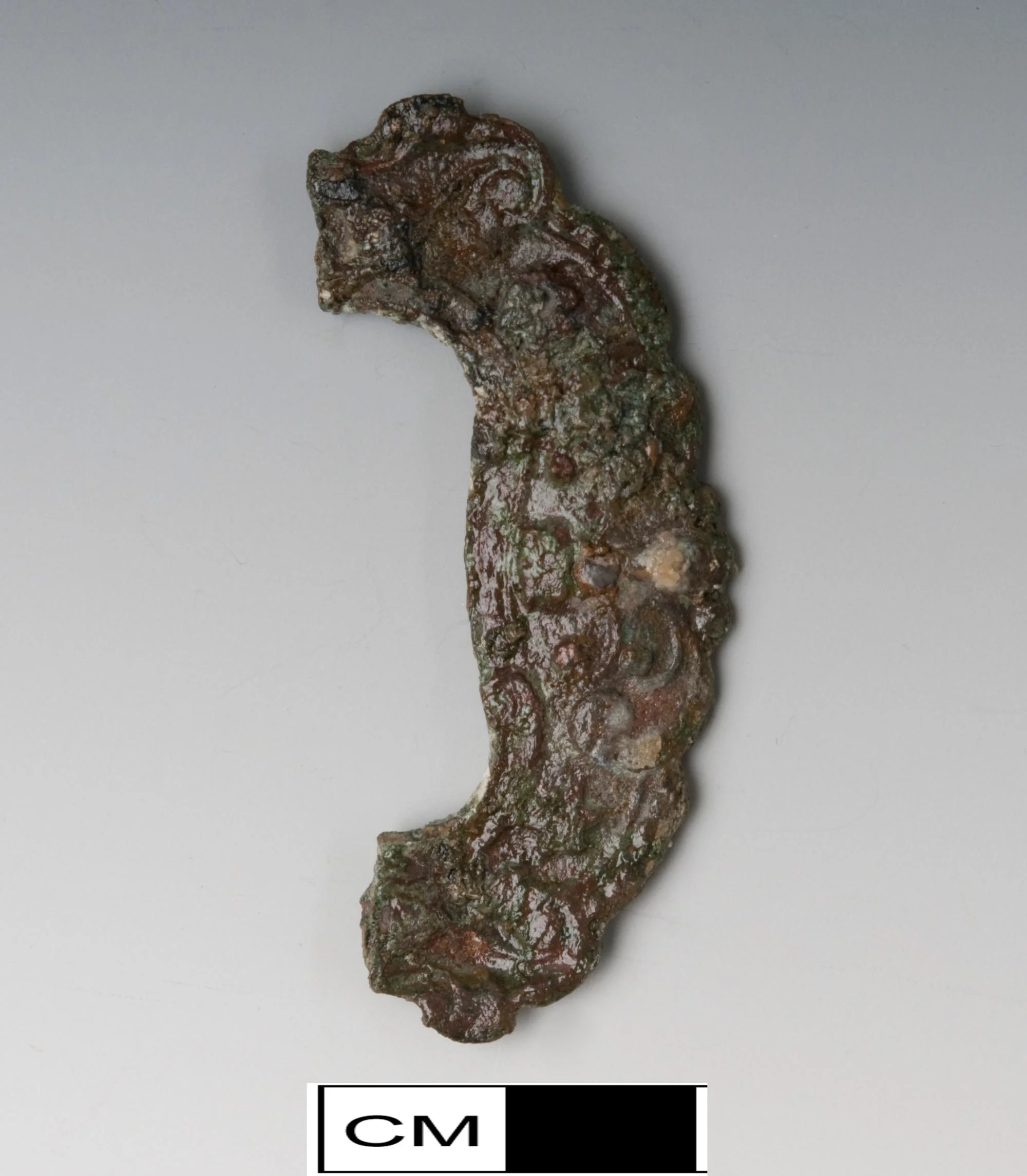 Molded scrollwork and foliate decoration. Scalloped edges.