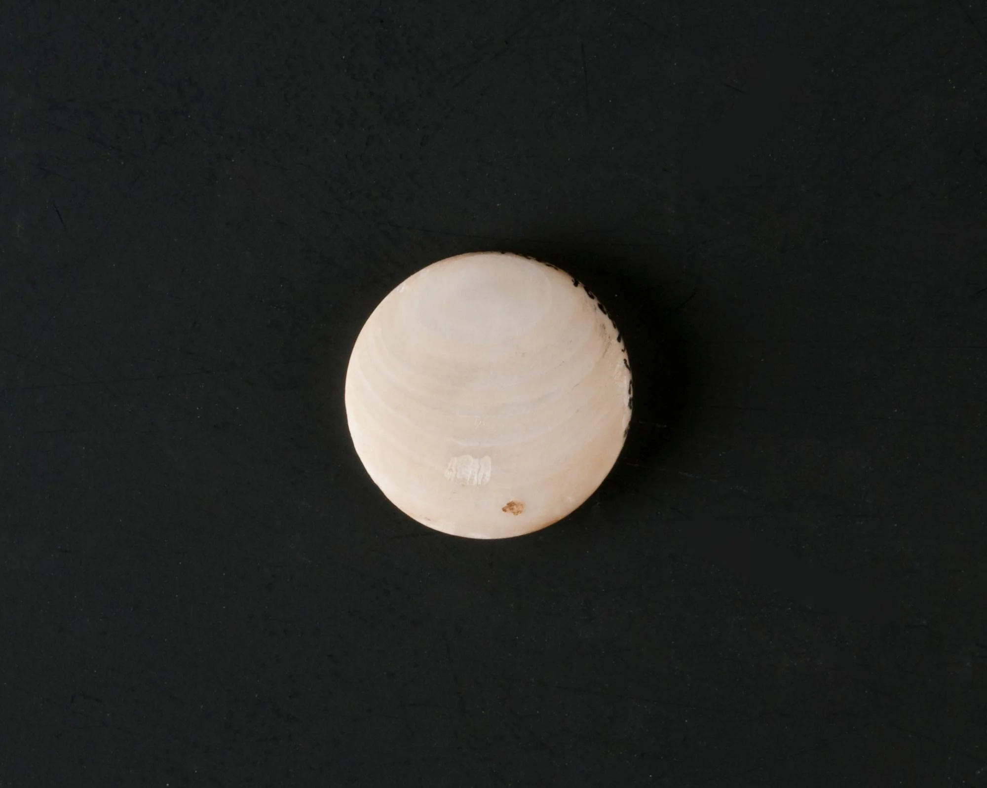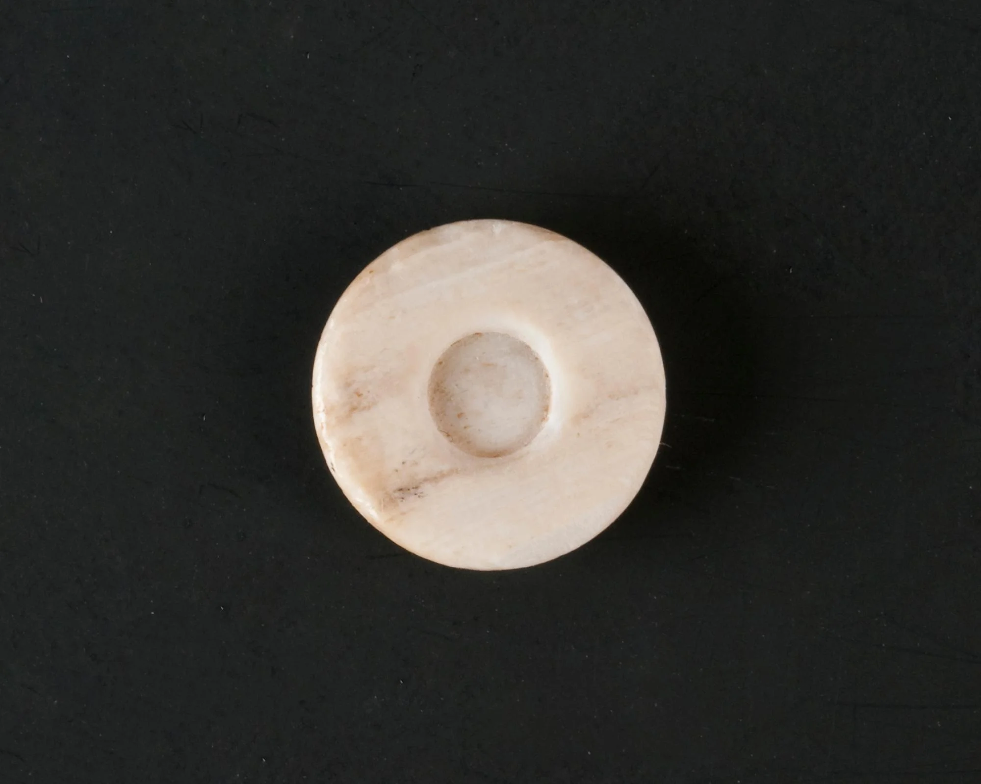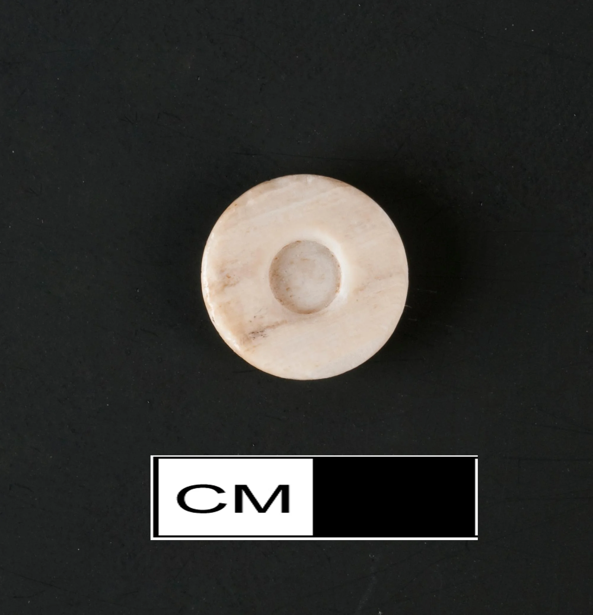 Shallow circular groove on back, 4.8mm diameter, probably for attachment to back. Probably associated with a sleeve button or cufflink.