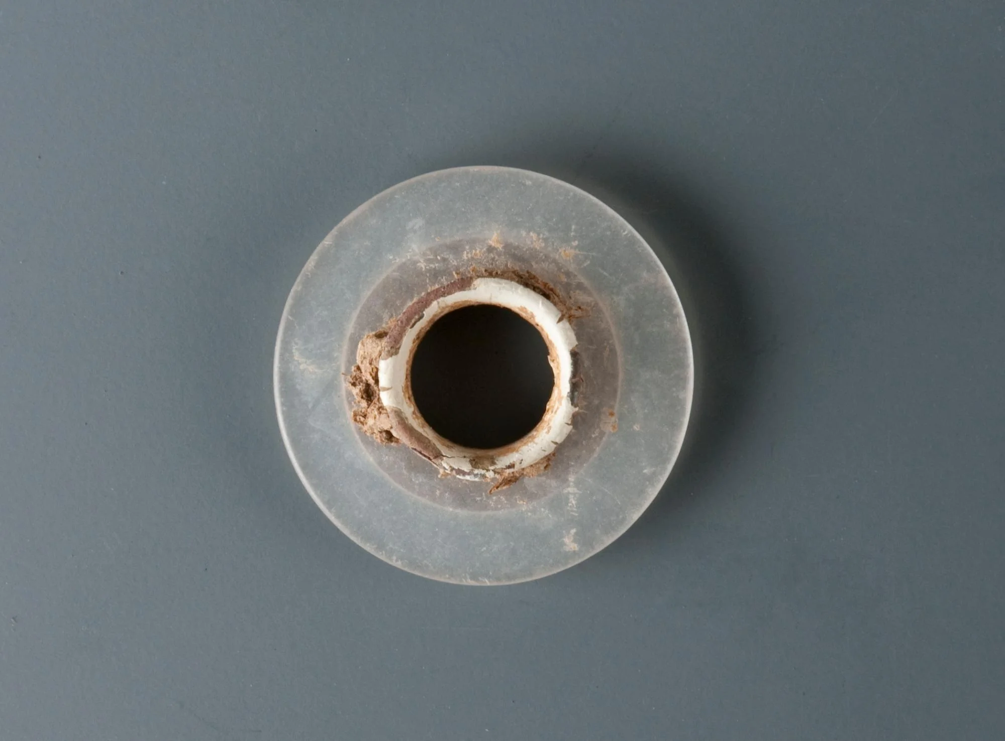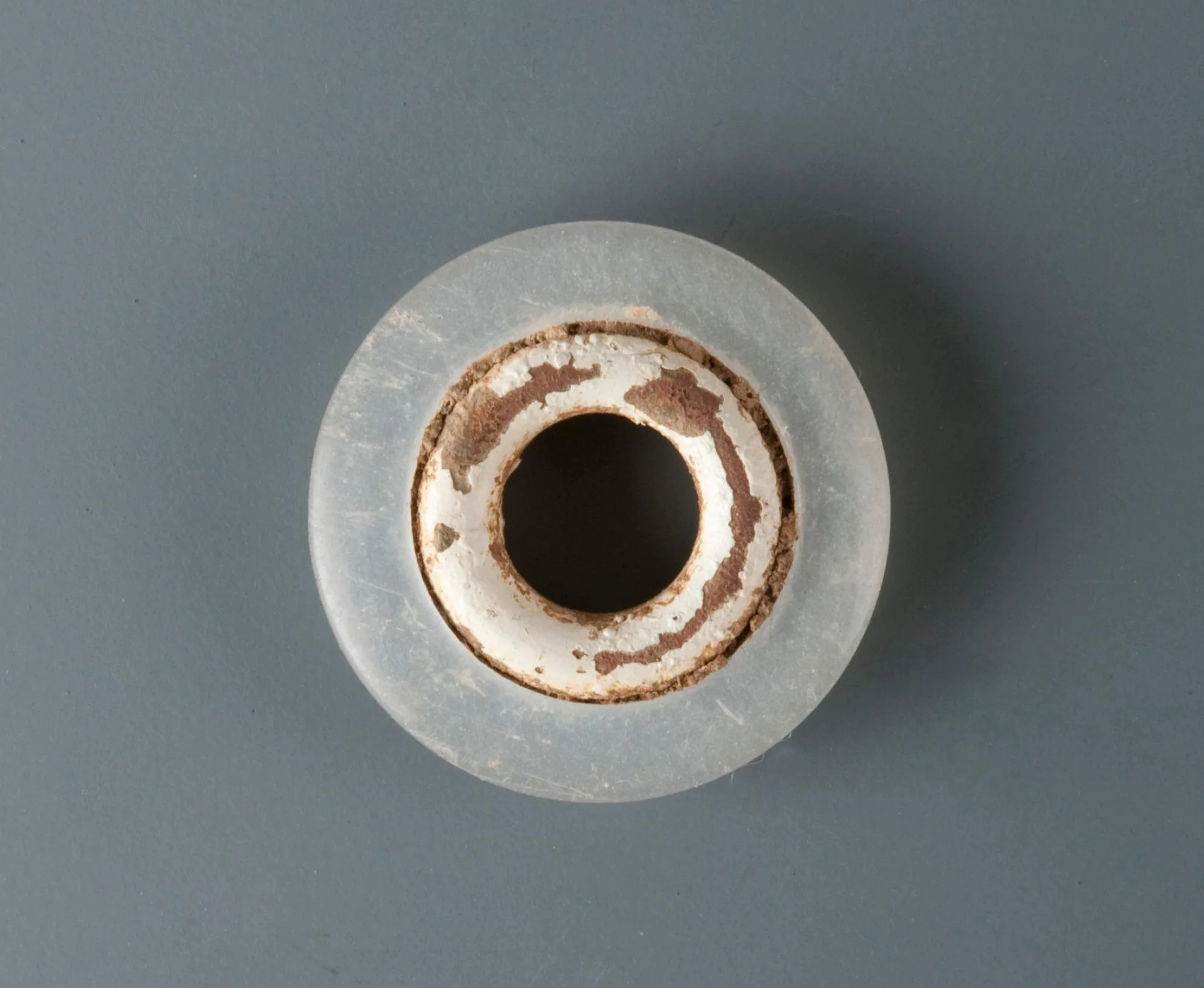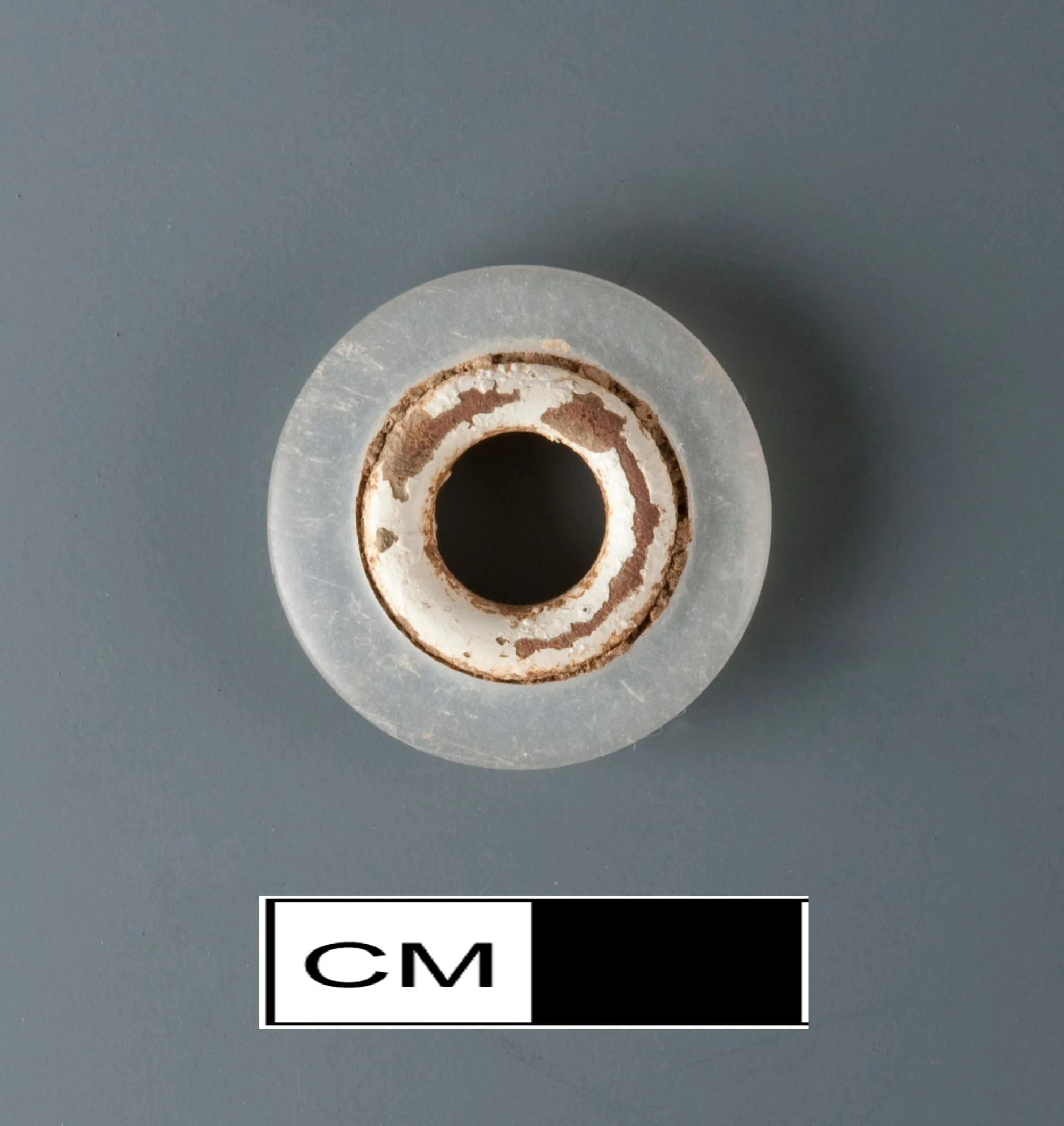 Interior ring of possible painted or coated copper alloy inset into exterior circular plastic ring.