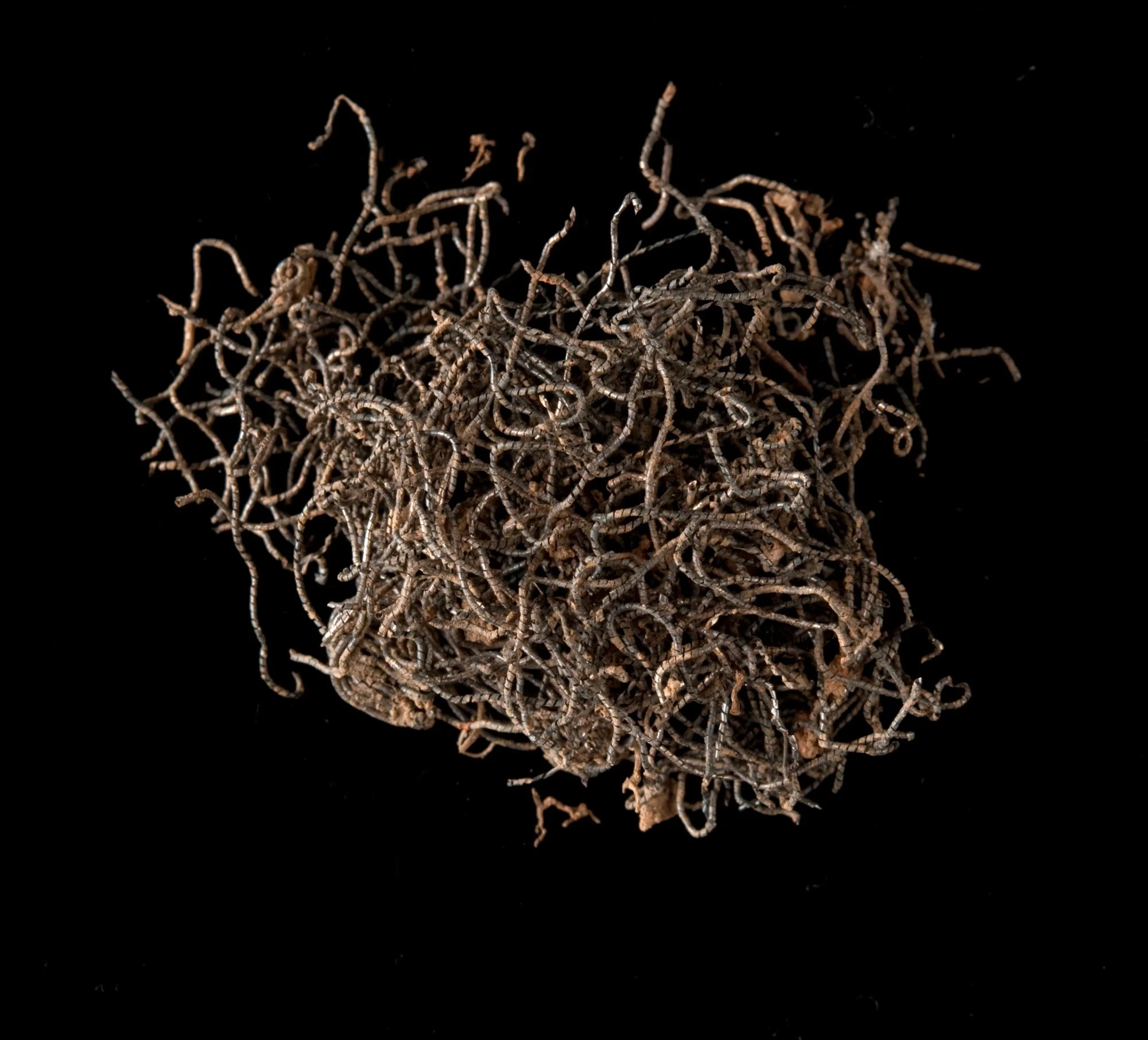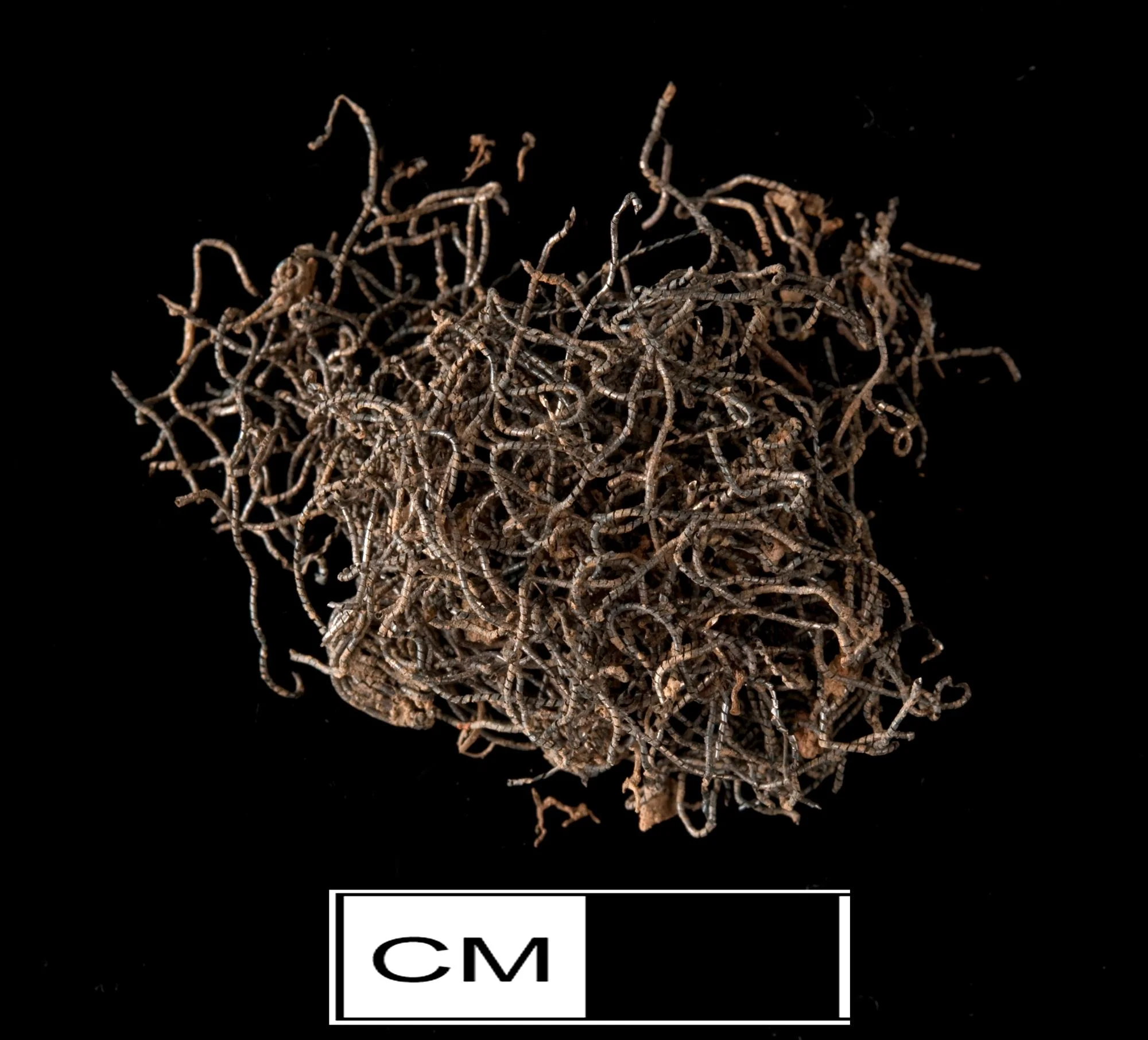 Multiple strands. Metallic thread coiled or wrapped around silk structural threads. Appears silver.