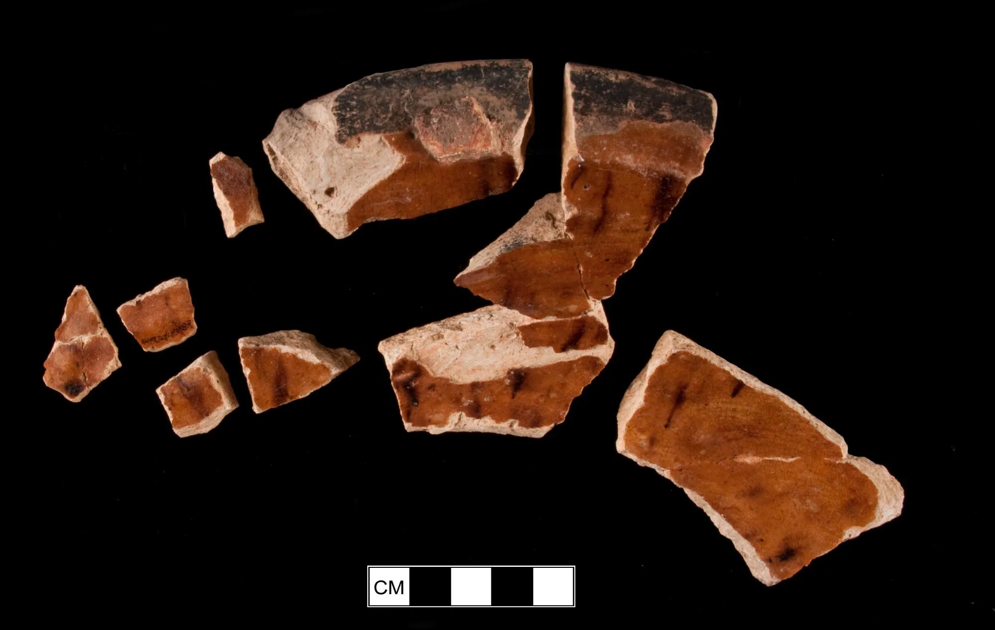 Paste is agatized which can be seen in larger utilitarian vessel forms of Managense mottled. Vessel clearly has lead glaze with managense specks. Rim just barely enough to measure diameter.