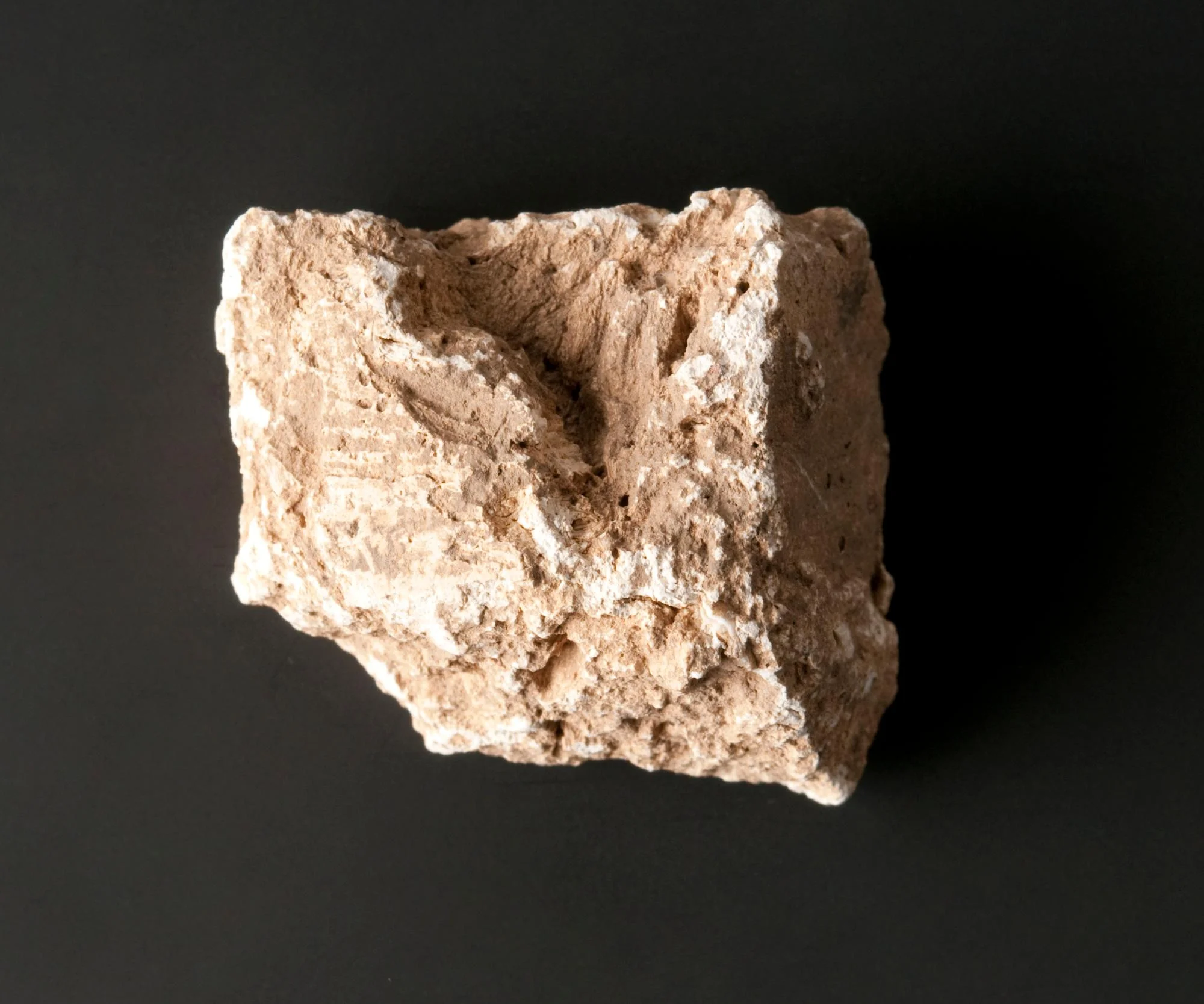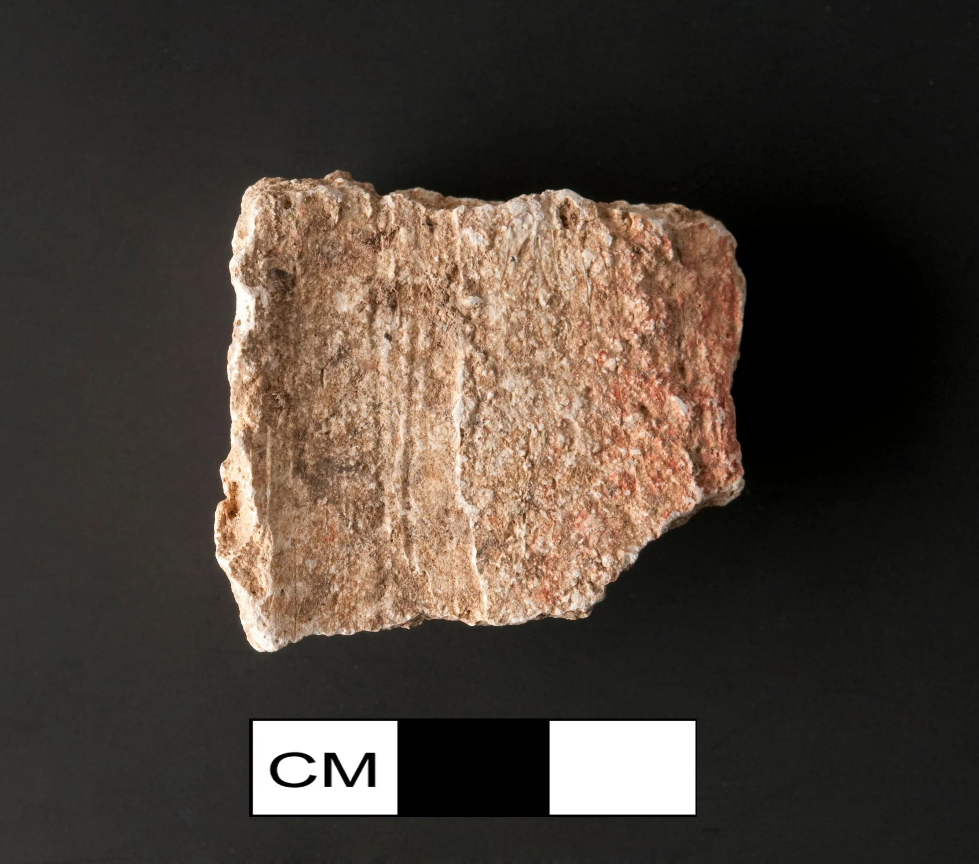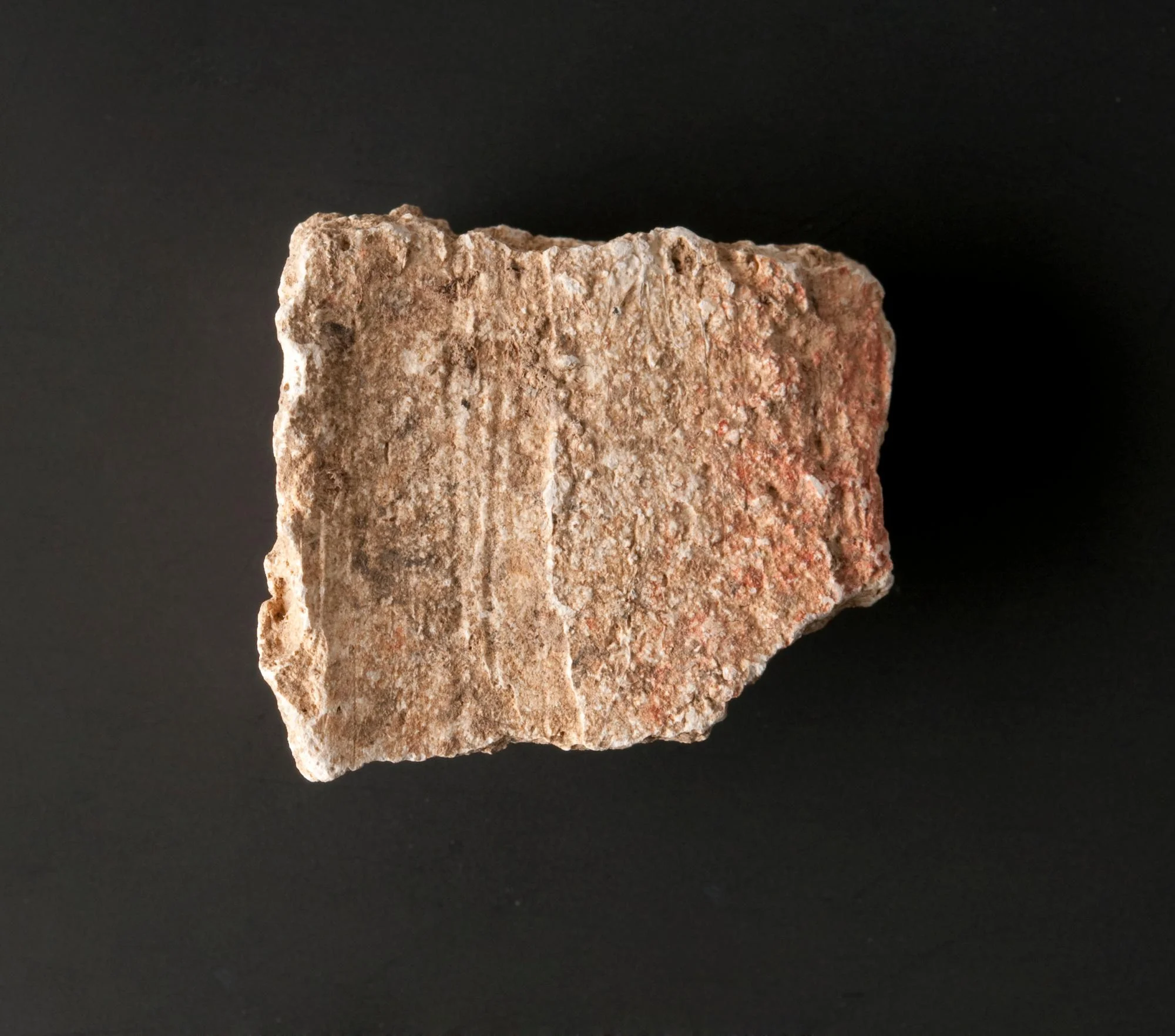 Red iron-oxide coloring on whitewashed surface of plaster fragment.