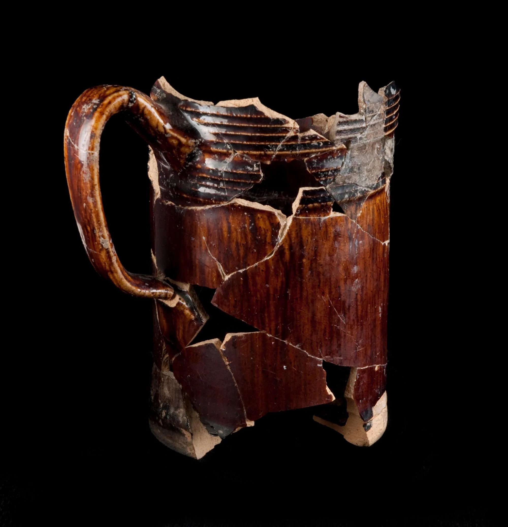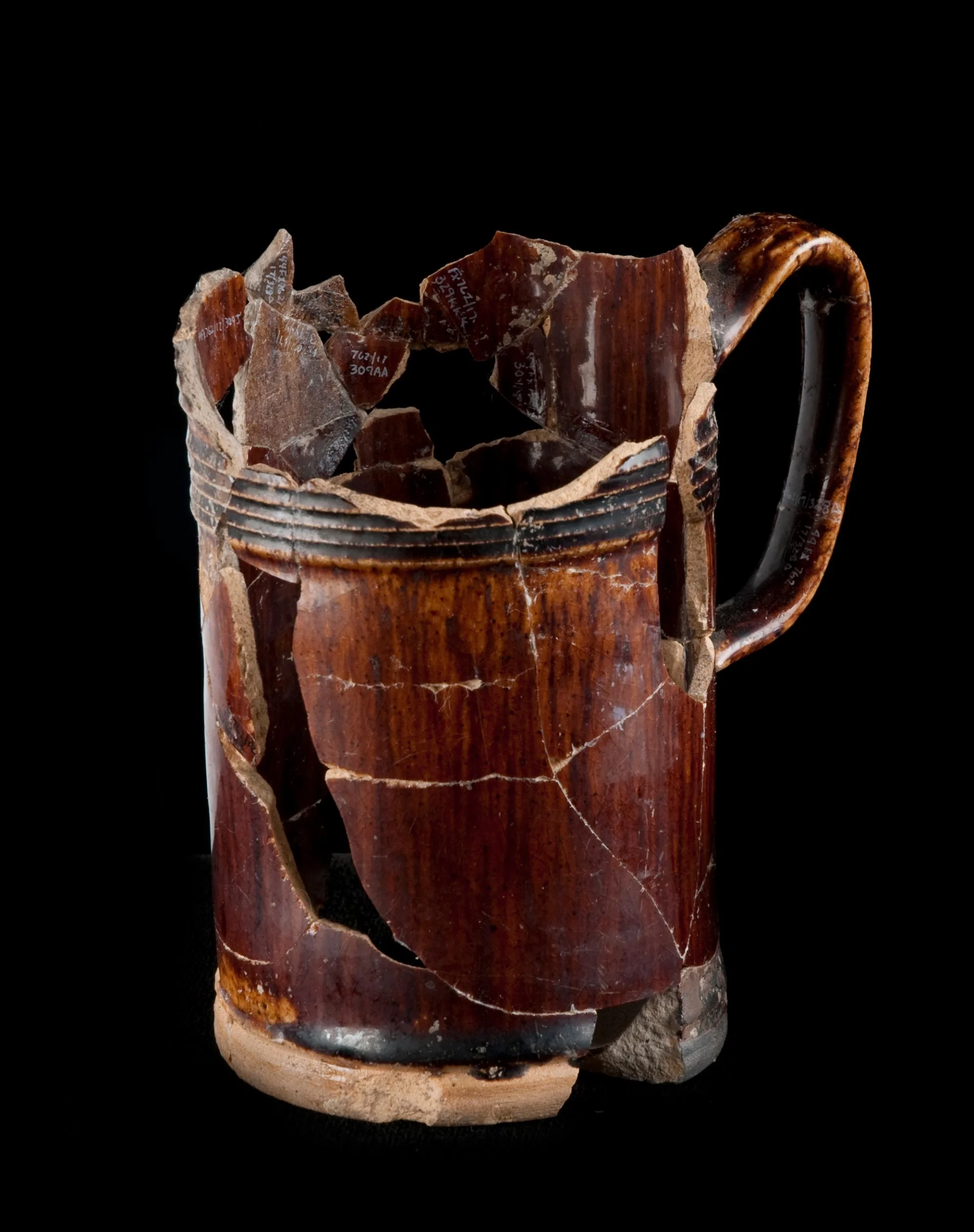 Cordoned around body at top of handle and just above base.