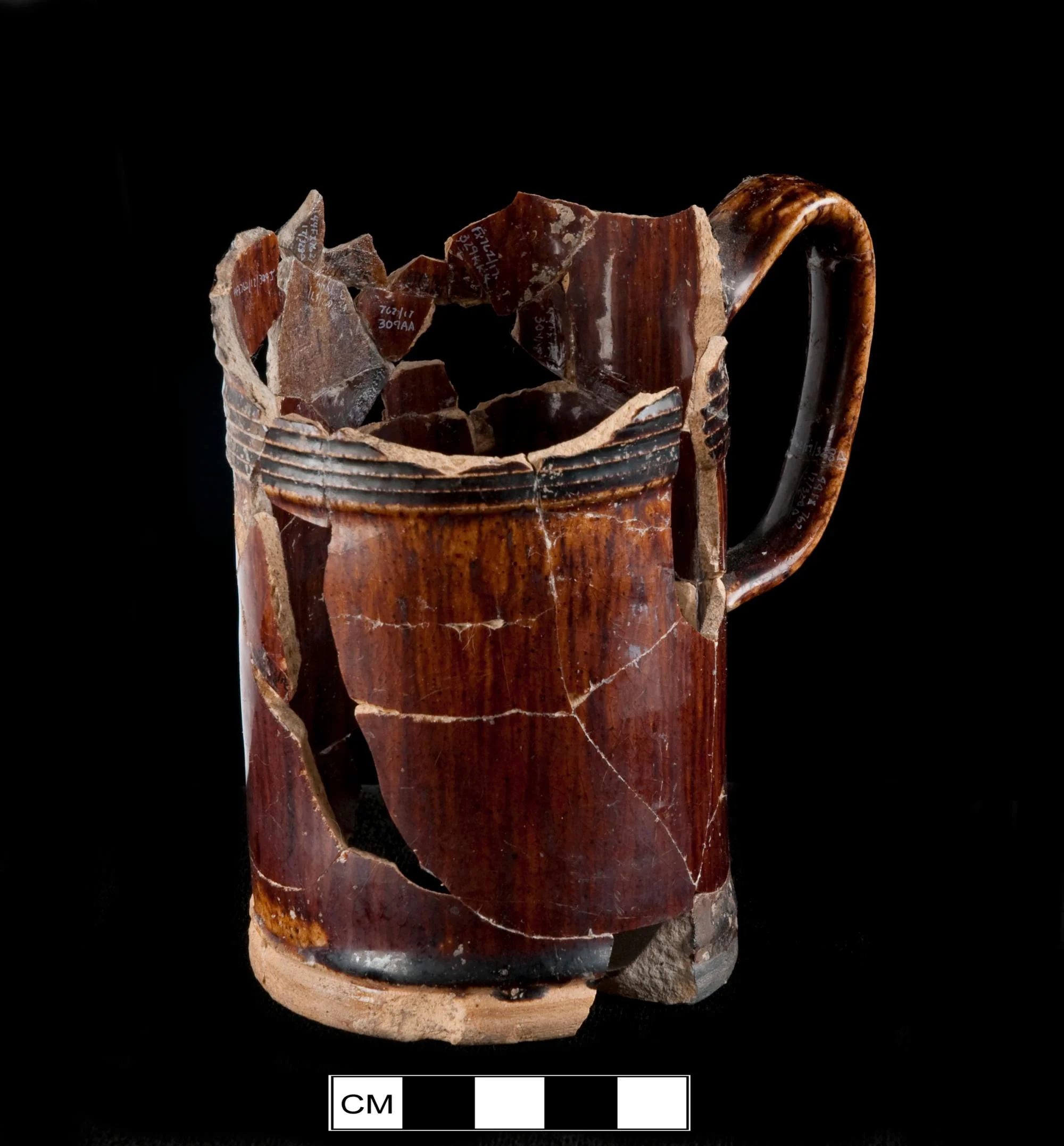 Based on cordoning, this vessel most likely measured 135mm in height. Capacity estimated at 1.24 pints or about a pint (using imperial measure).