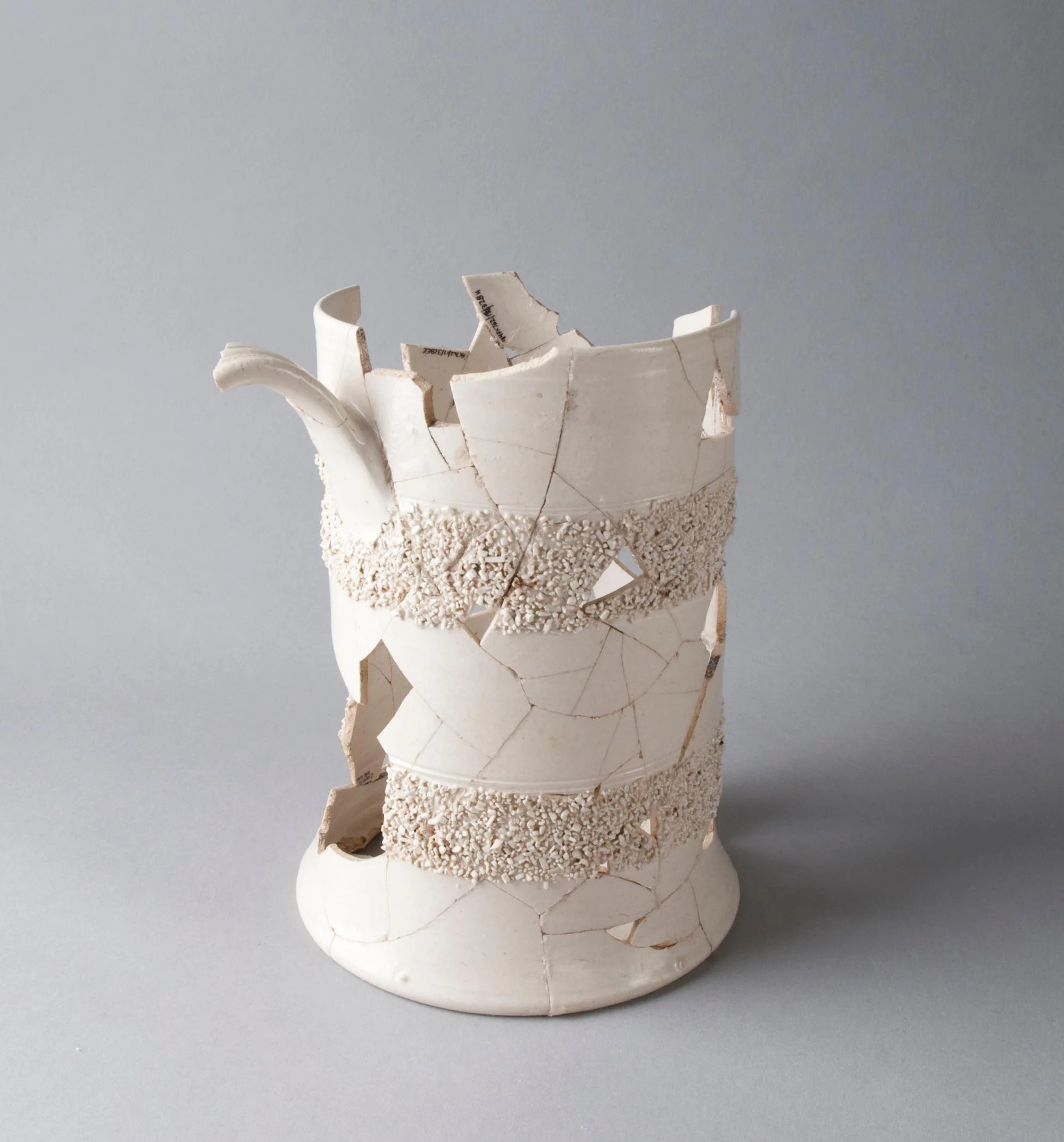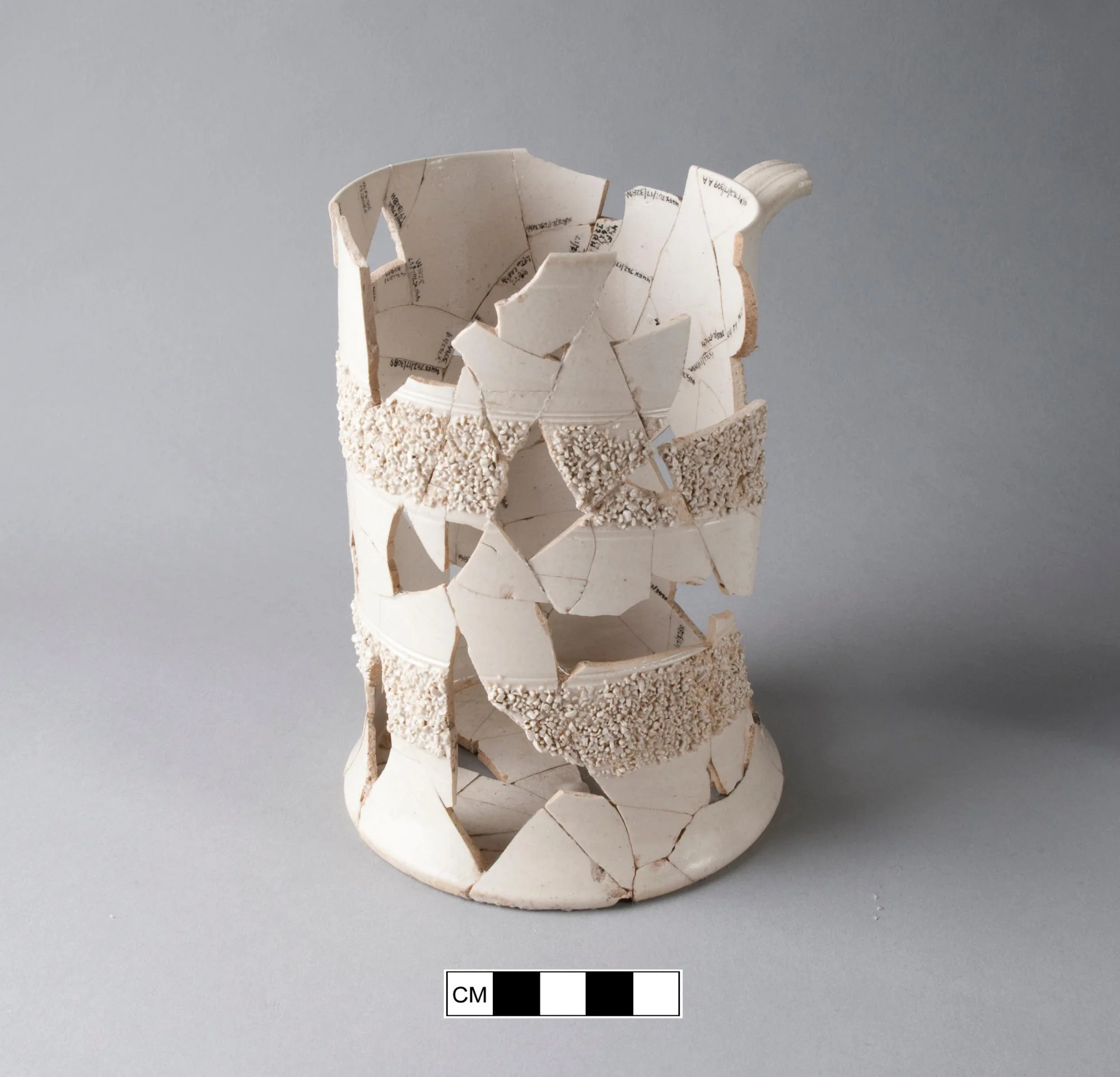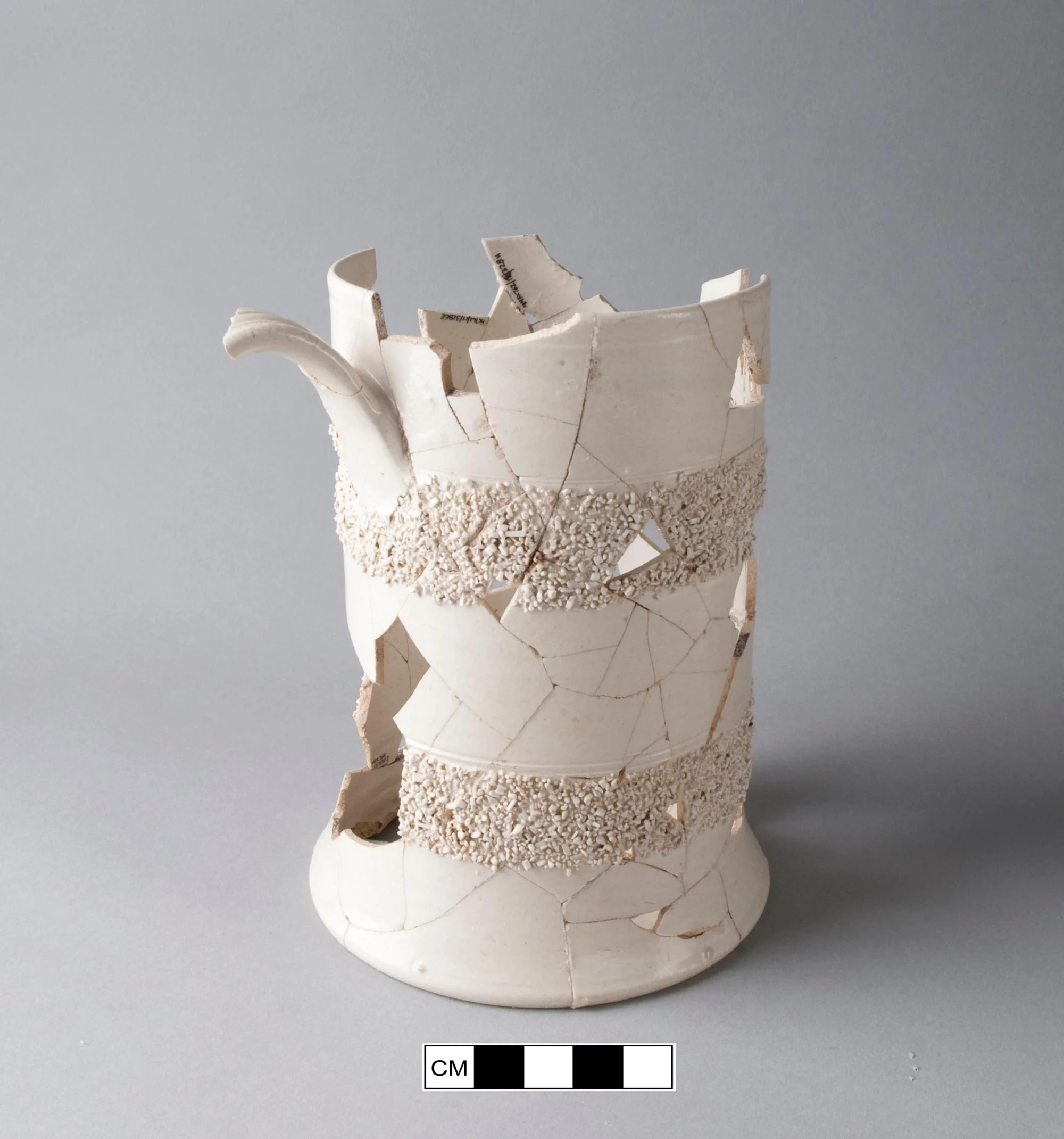 Flared at base; two bands of rustication. Capacity estimated at 2.87 pints or almost a quart (using imperial measure).