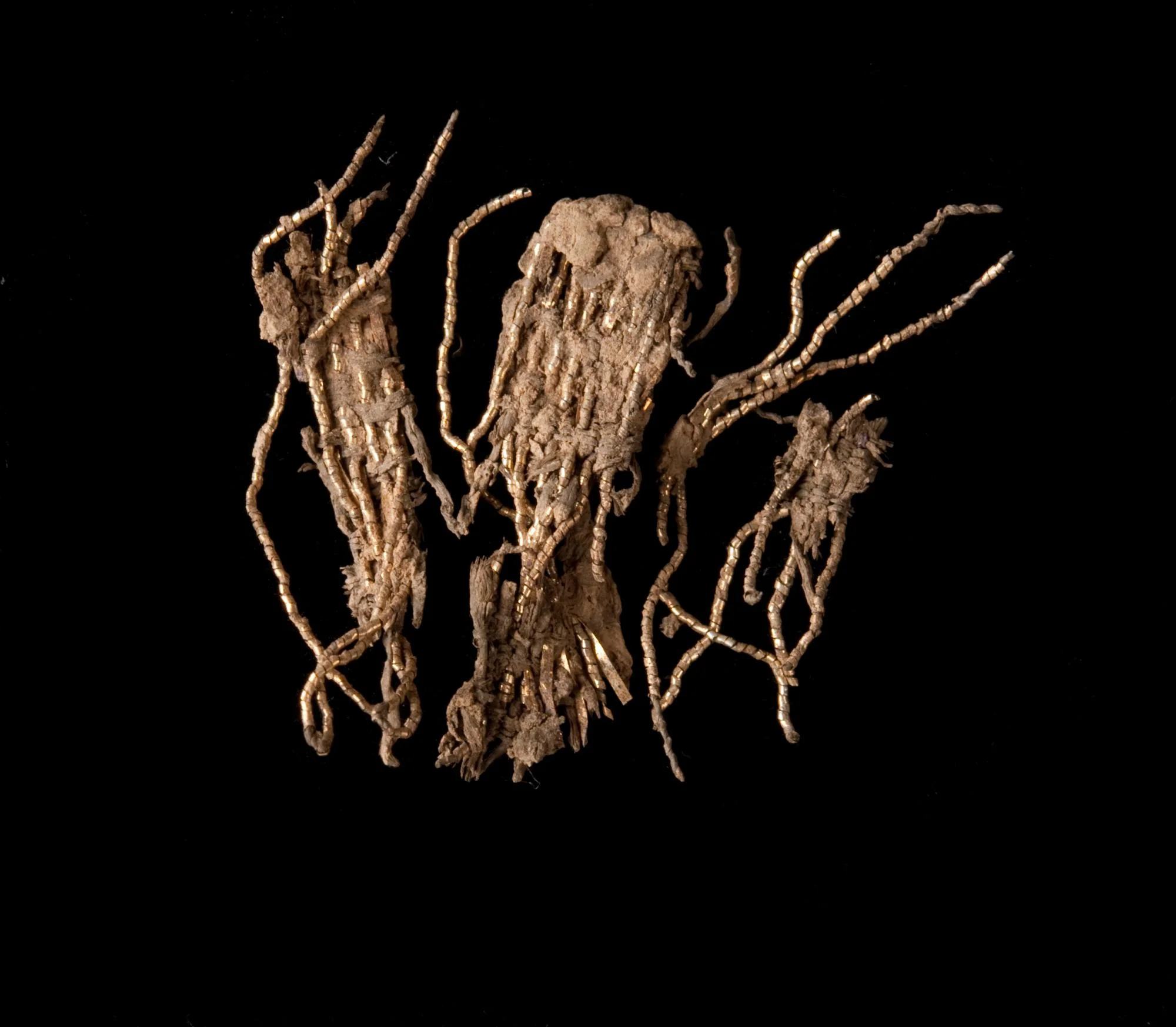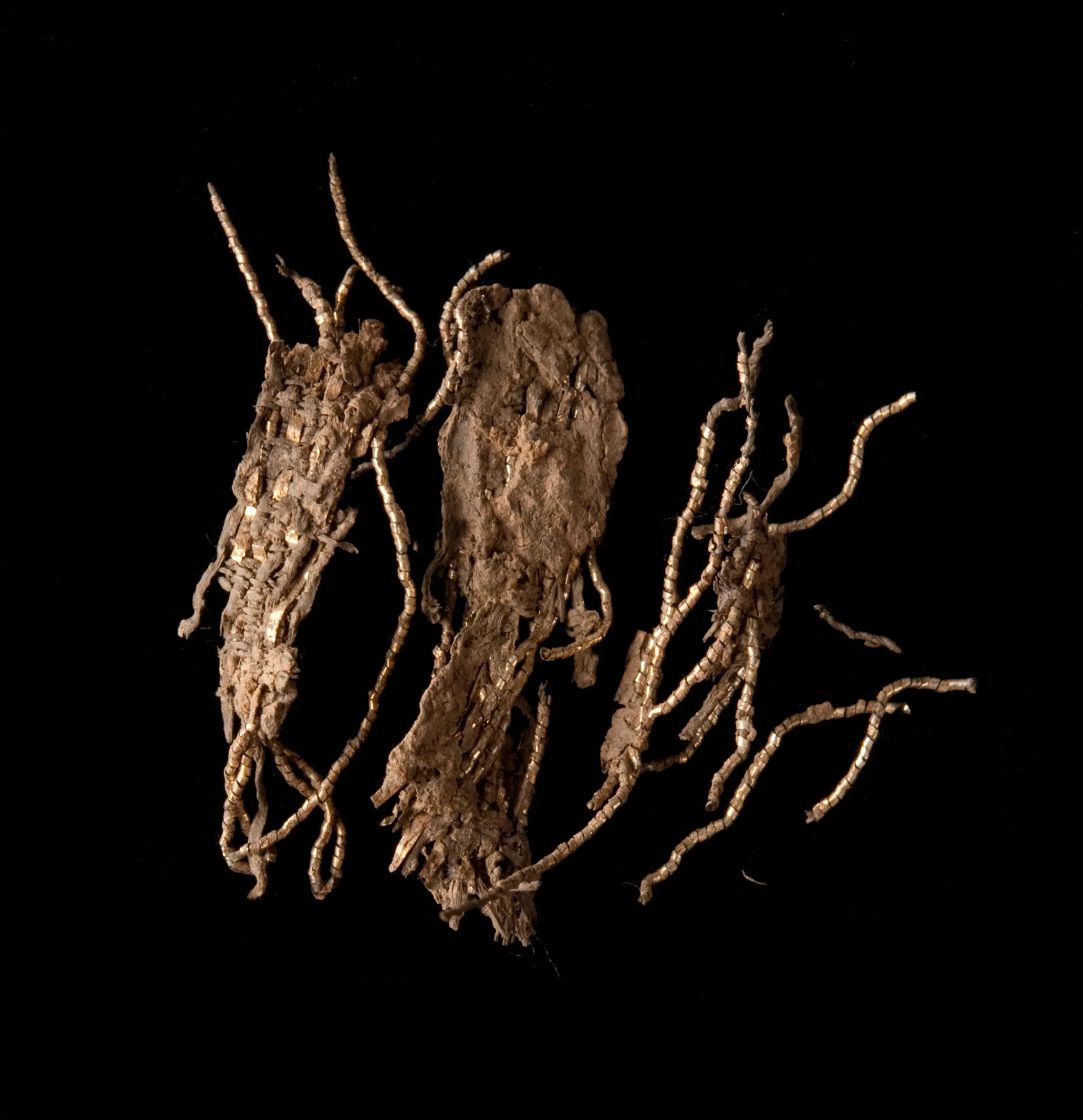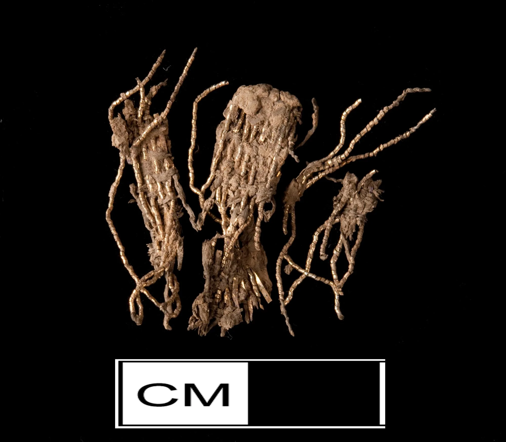Multiple strands. Possibly button-related. Gold gilt thread with silk core; S-twist