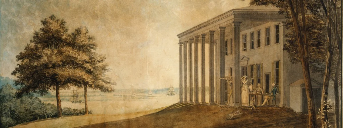 British-trained architect Benjamin Henry Latrobe painted this charming scene of the Washingtons at ease on the piazza at Mount Vernon following his visit there in 1796. George and Martha Washington are shown seated at a tea table bearing a large hot water urn. They are accompanied by granddaughter Eleanor (Nelly) Parke Custis, wearing a fashionable Grecian gown, and an unidentified young man with a spyglass who may be Latrobe himself. Nelly's dog, Frisk, plays on the lawn with a child, possibly belonging to Washington's aide, Tobias Lear. There are many romanticized depictions of the Washingtons at Mount Vernon, but only two were created during George Washington's lifetime and only Latrobe's appears to have been drawn from life (Latrobe's signature on this piece is accompanied by the phrase "nat. del.," meaning drawn from nature).