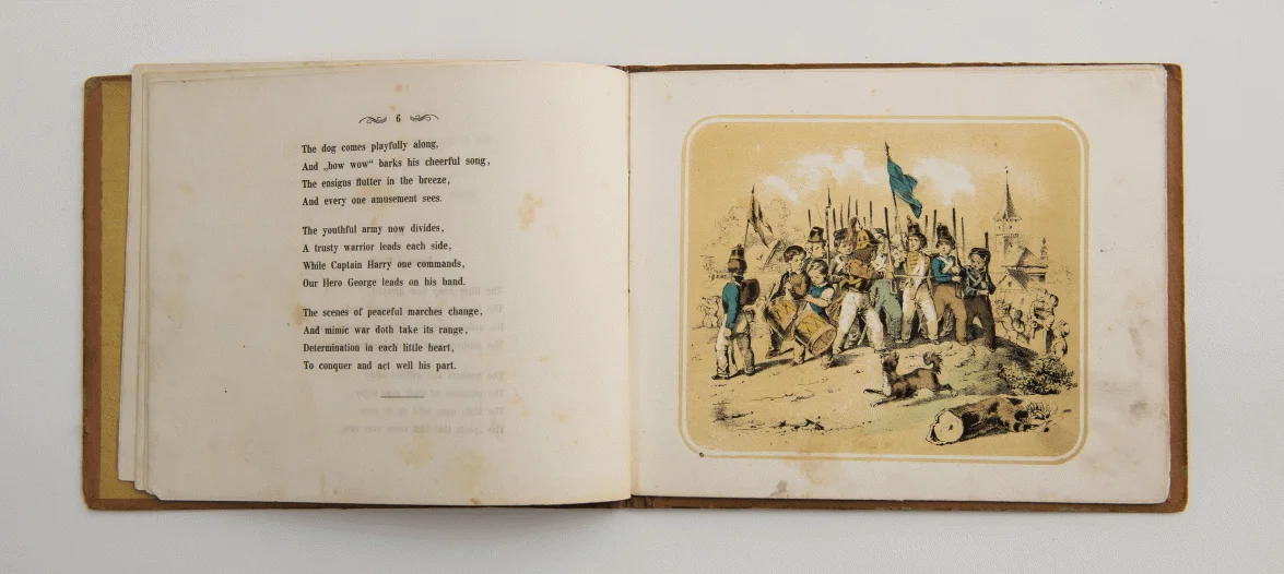 Beyond advertisements, the ephemera collection contains several children’s books related to George Washington. A book published in 1856 titled Washington as a Child: A picture book for good boys tells the story of a young George playing war with his childhood friends.