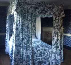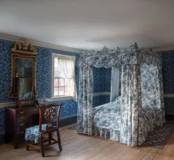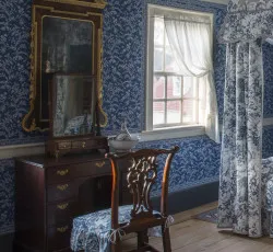 The Blue Room, a second-floor bedchamber located at the head of Mount Vernon's main staircase, incorporates changes from at least three significant moments in the Washingtons' lives.