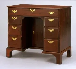 Among the mid-century (18th century that is) style furnishings that will make their appearance in the Blue Room is a mahogany bureau dressing table, a Richmond-made reproduction of a Williamsburg-made original that once seamlessly translated British style to the colonies.