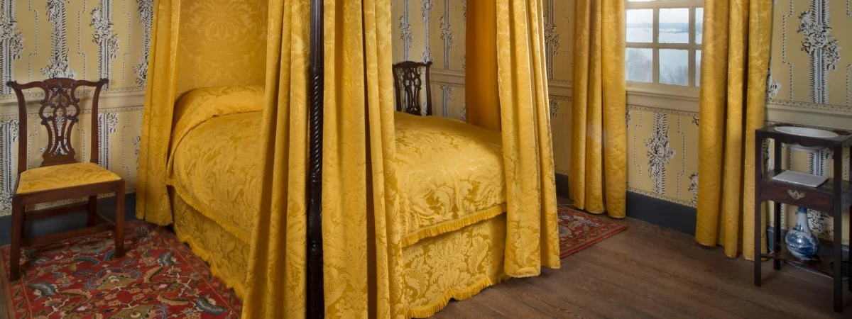 A re-creation of the yellow damask-draped bedstead takes center stage in the Yellow Room, crowned with a damask-covered, carved cornice.