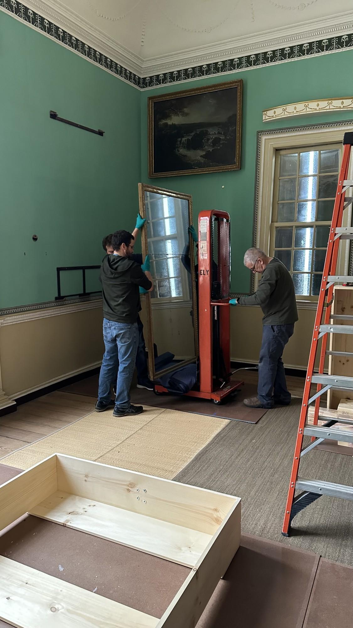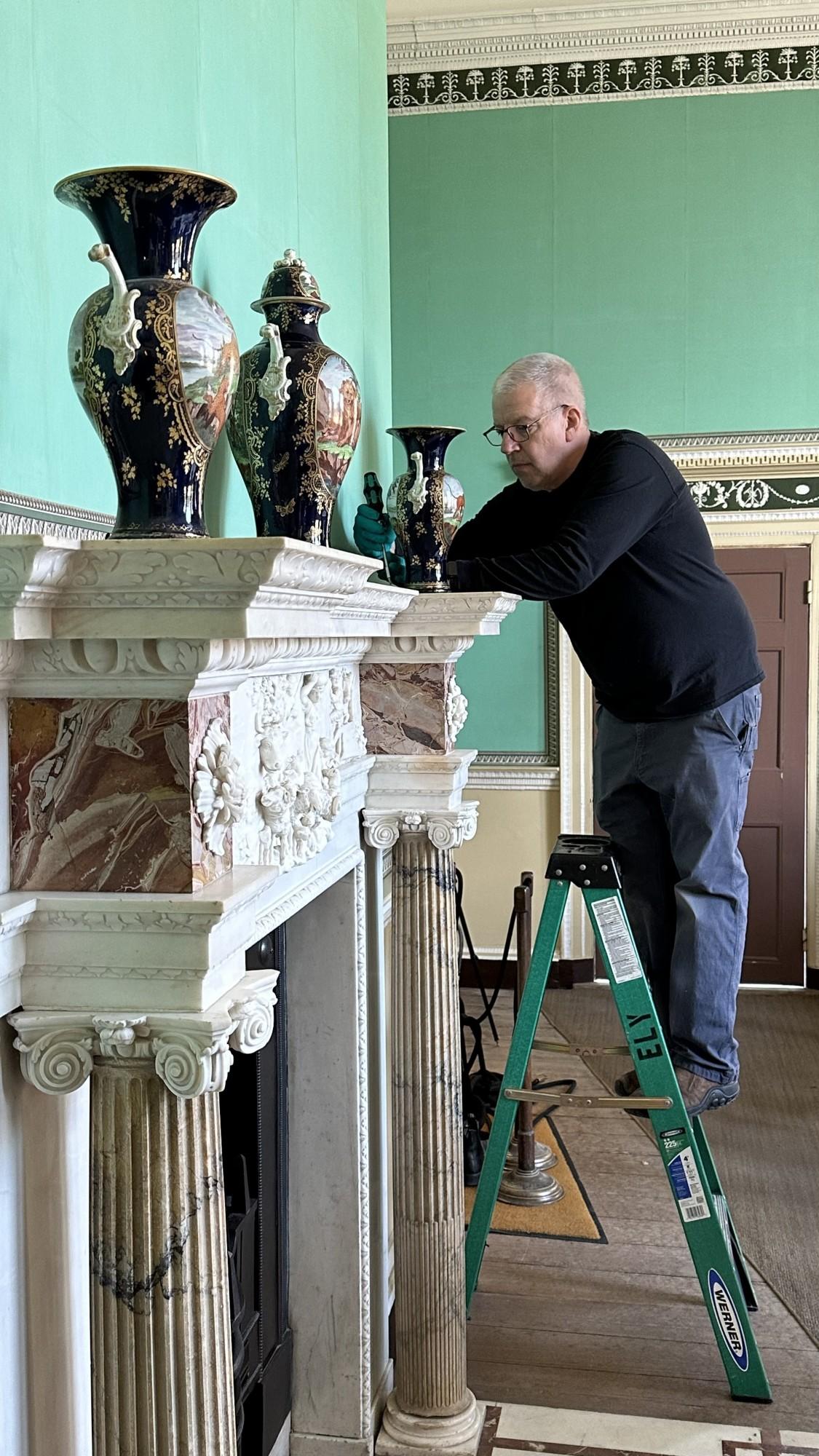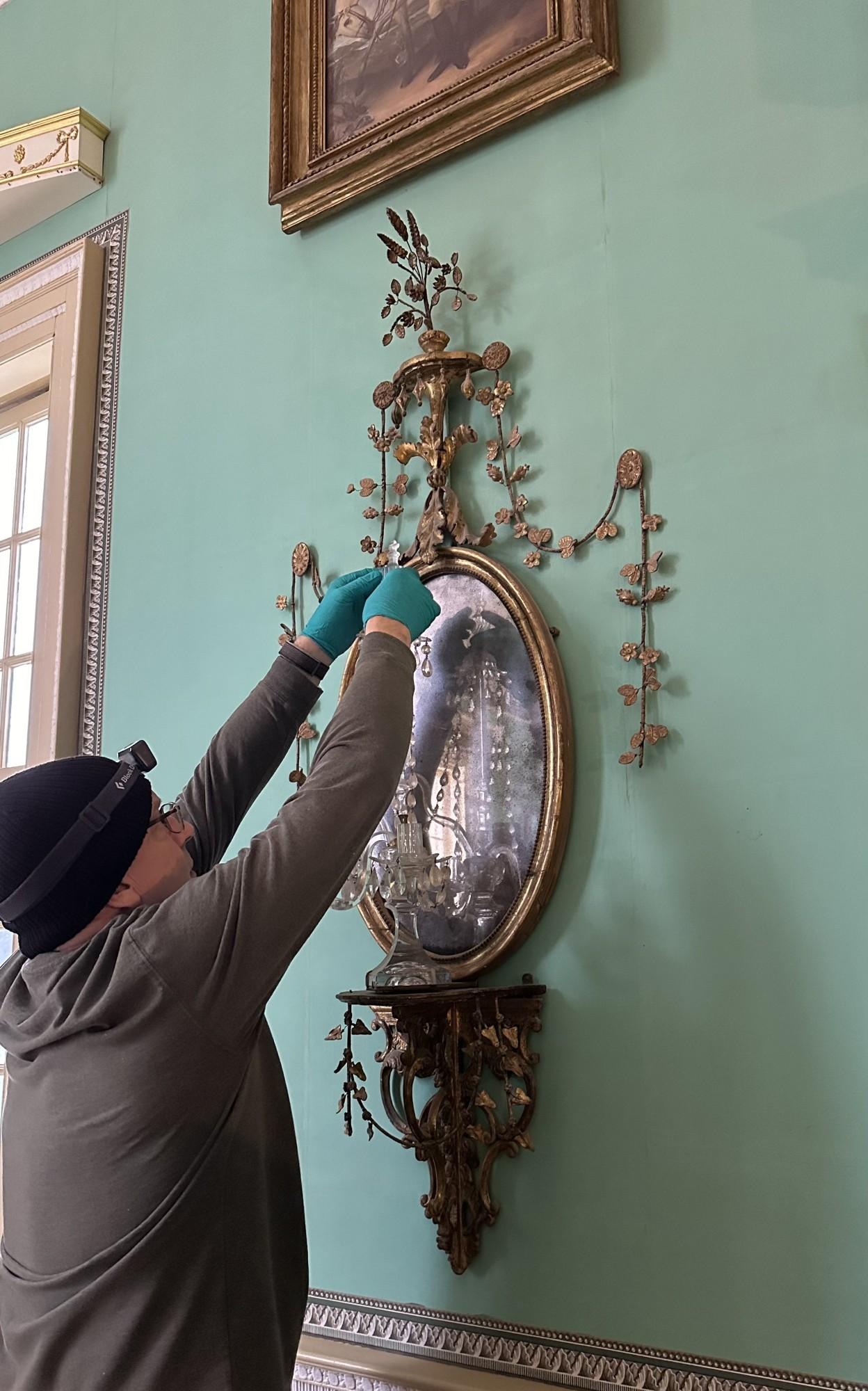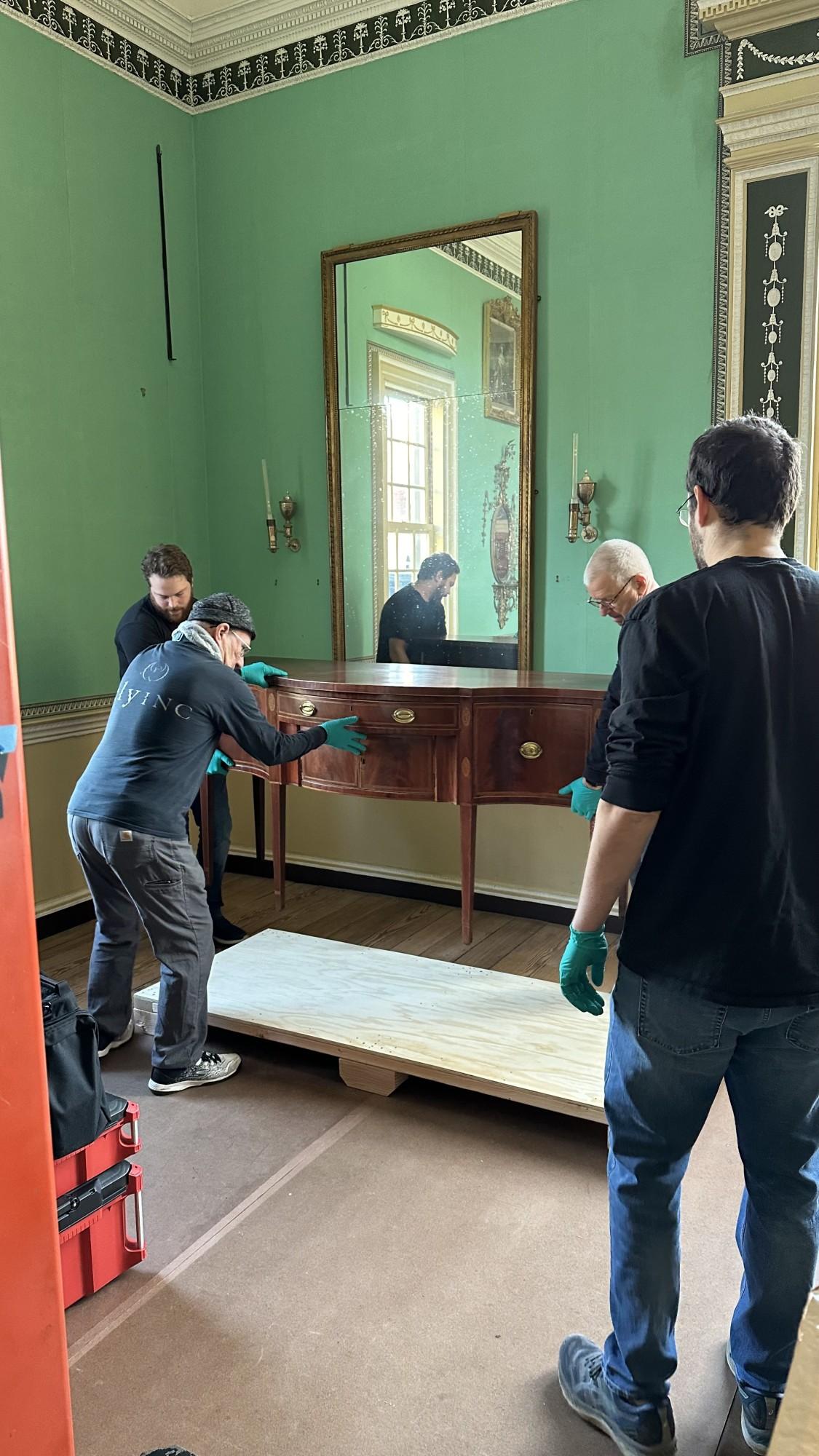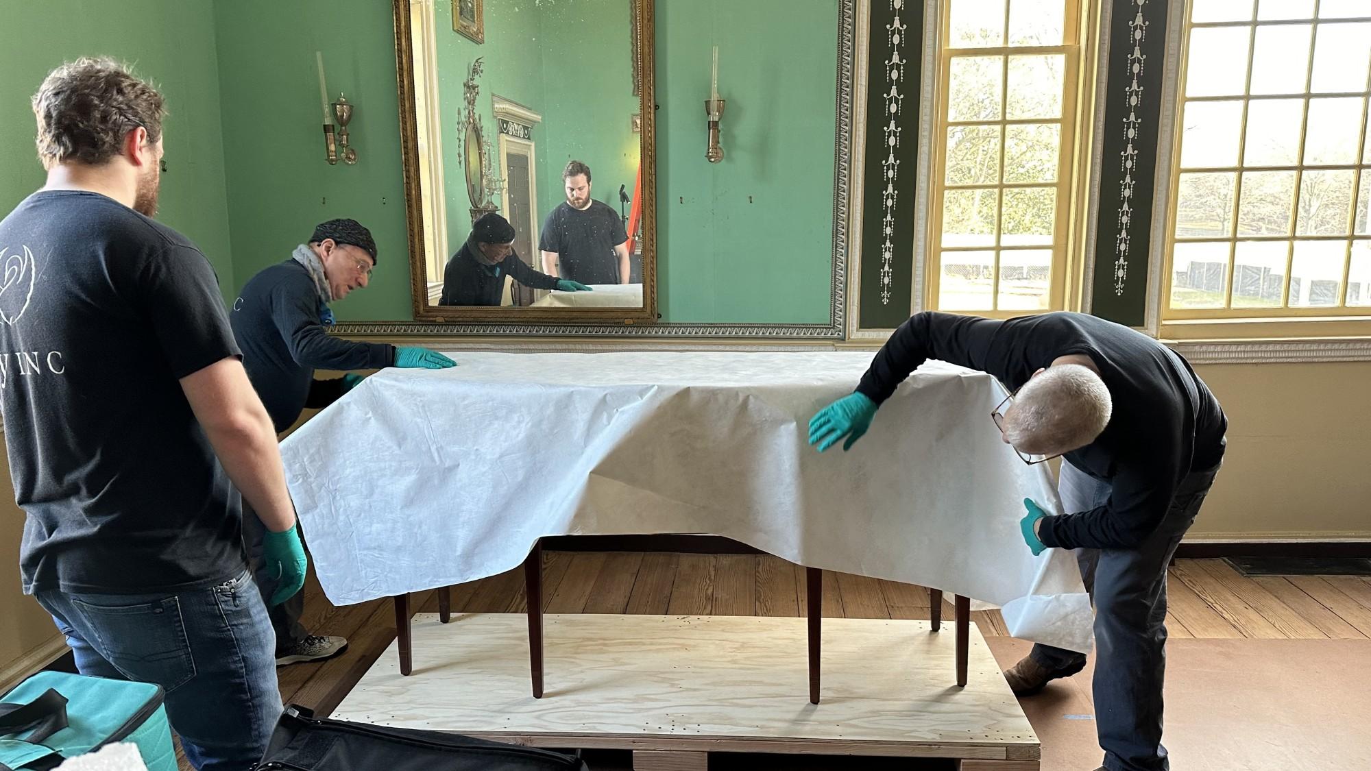 In early 2024, Mount Vernon began Phase 1 of the Mansion Revitalization Project, which requires preservation carpenters to work extensively in the New Room as they repair elements of the Mansion’s framing. In order to best protect the array of objects in the New Room, many of which are Washington originals, Mount Vernon’s Collections team needed to remove them to a stable environment.