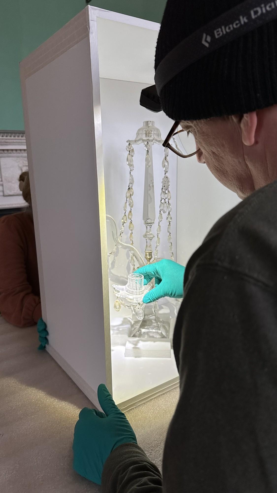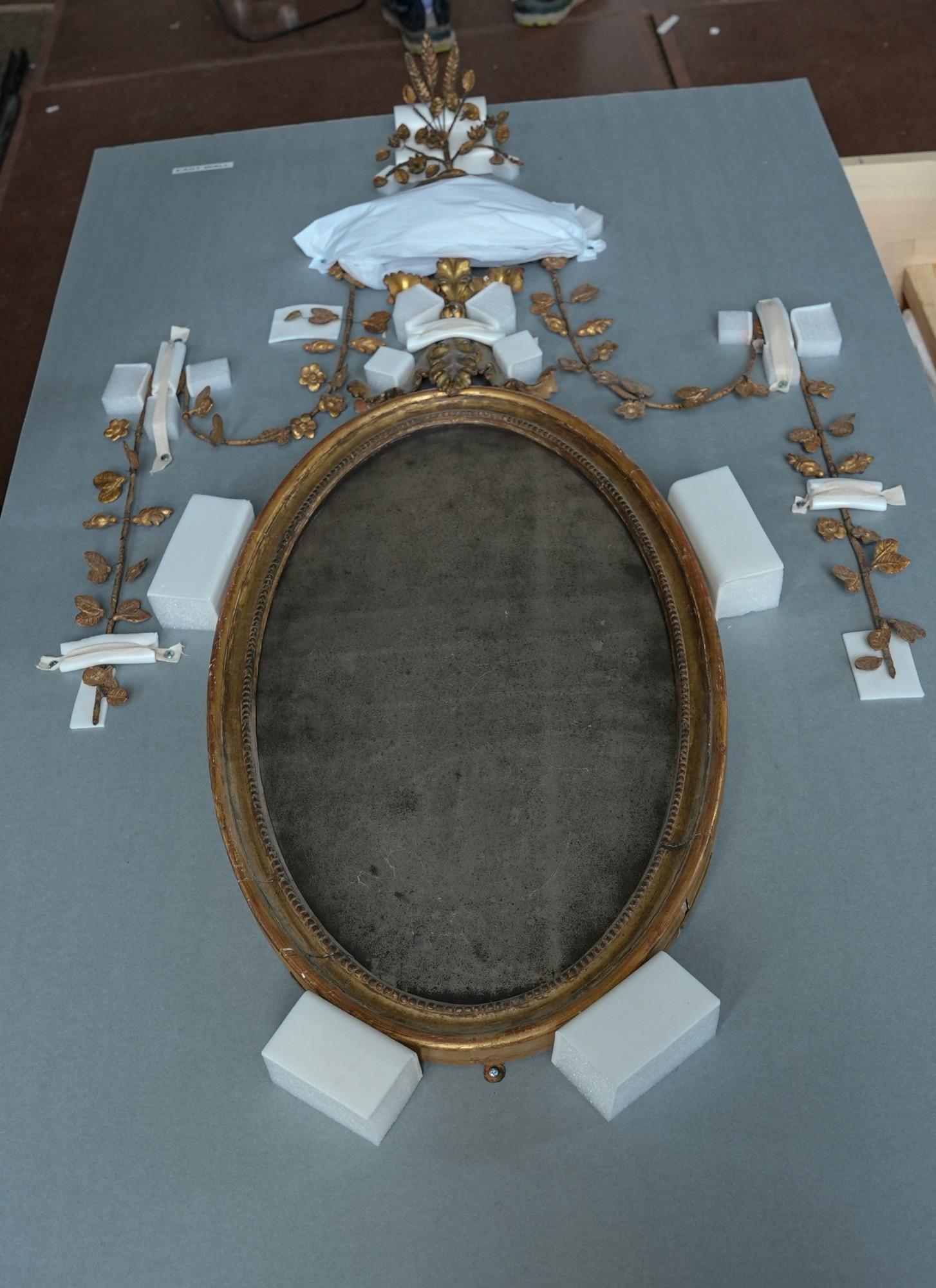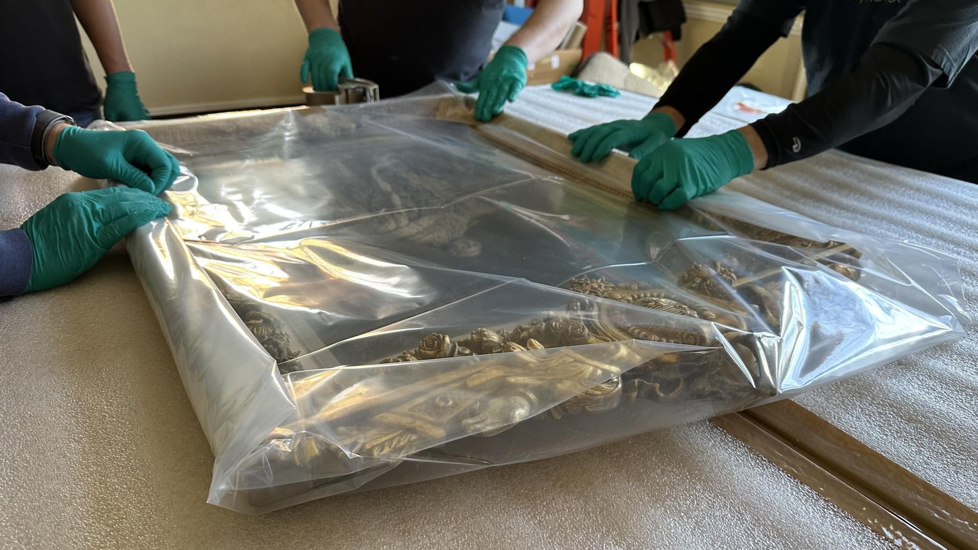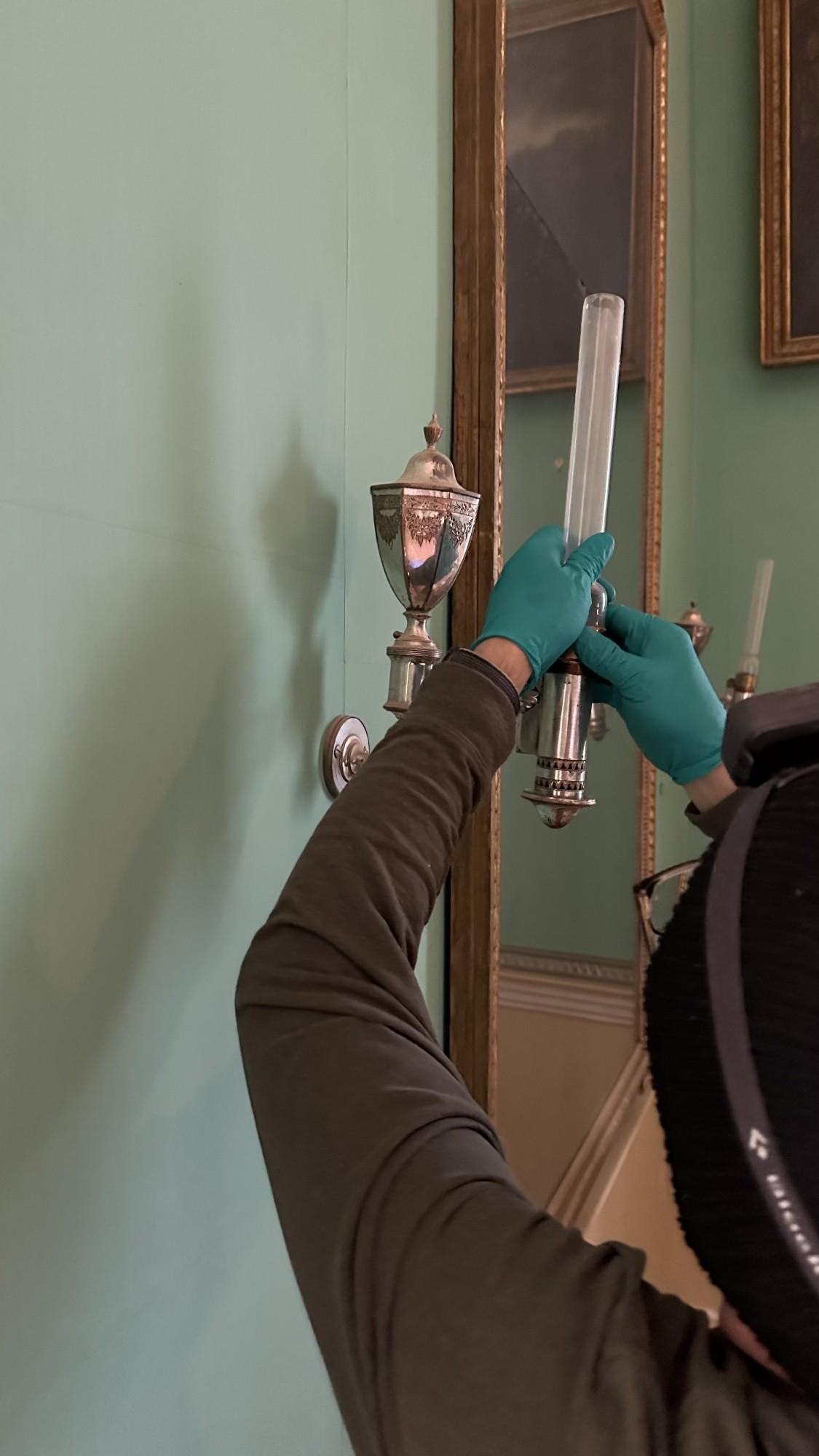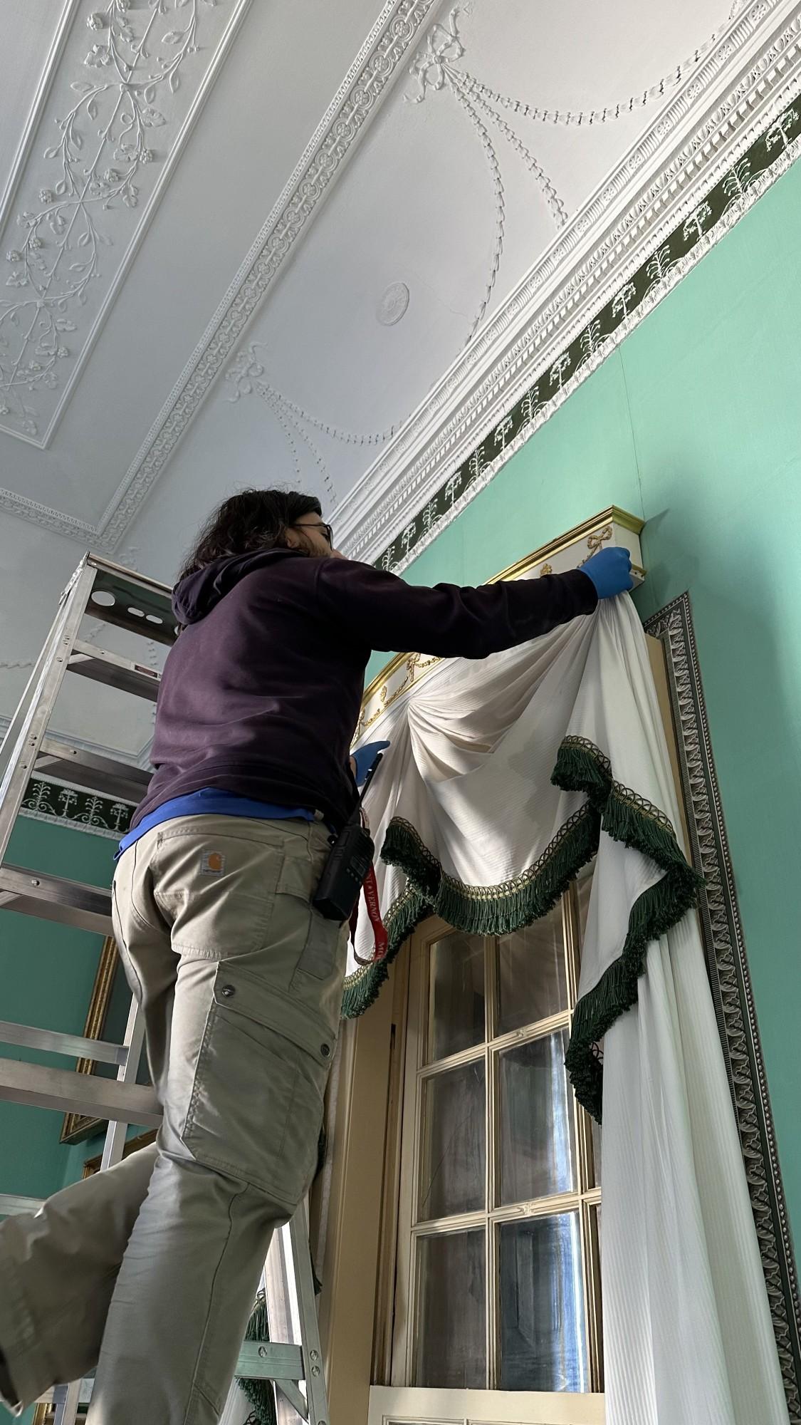 In early 2024, Mount Vernon began Phase 1 of the Mansion Revitalization Project, which requires preservation carpenters to work extensively in the New Room as they repair elements of the Mansion’s framing. In order to best protect the array of objects in the New Room, many of which are Washington originals, Mount Vernon’s Collections team needed to remove them to a stable environment.