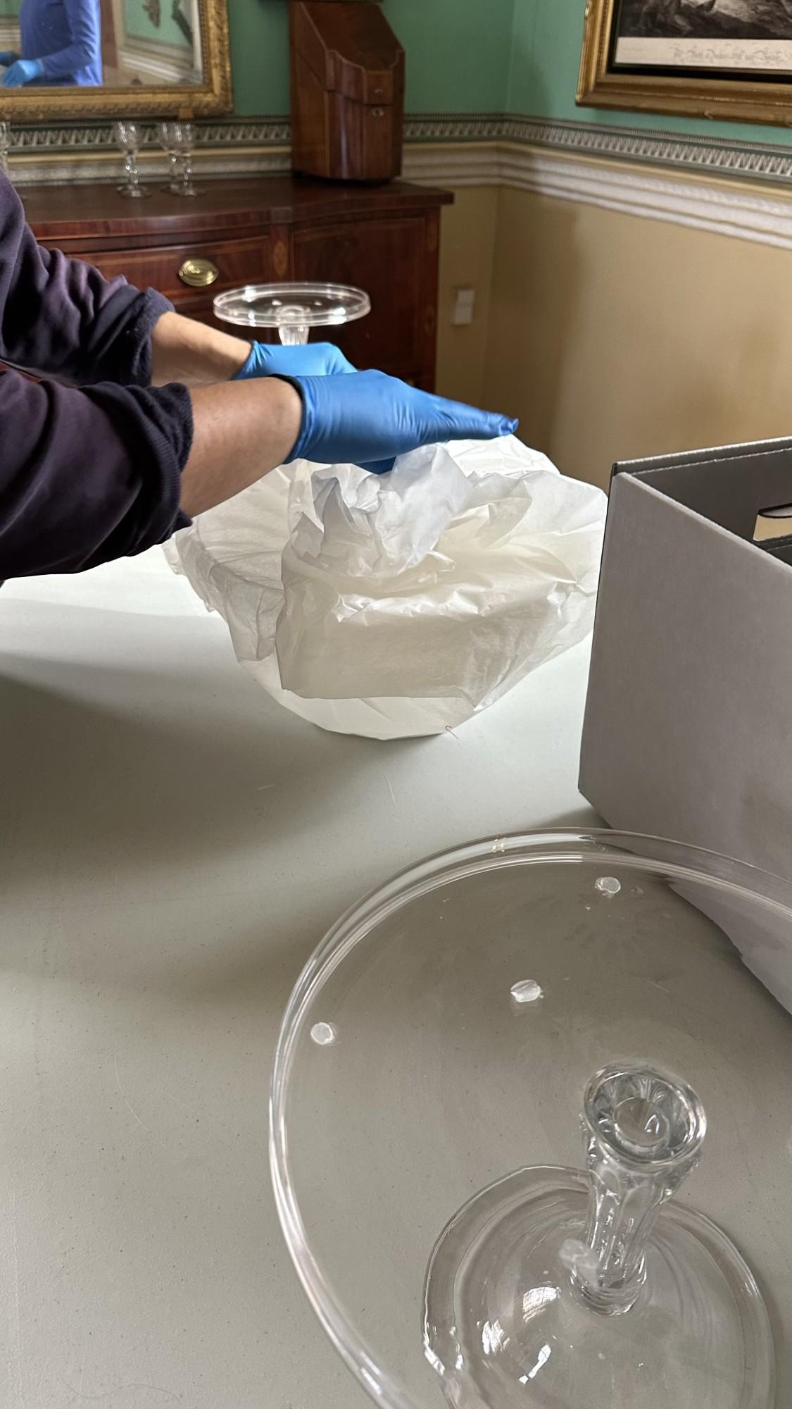 With deliberate, gloved hands, a member of Mount Vernon’s Fine and Decorative Arts Collections team lowers a mahogany knife case into an acid-free storage box in Mount Vernon’s New Room. He carefully surrounds the case with packing material—bubble wrap and acid-free tissue paper—which will ensure that the object moves as little as possible during transportation. He slowly lifts the box, looking for even the slightest sign of movement from the knife case within.