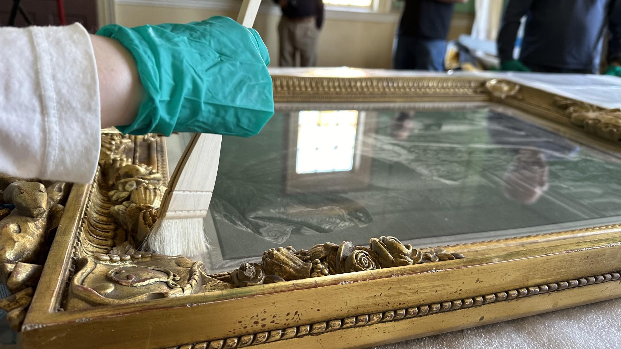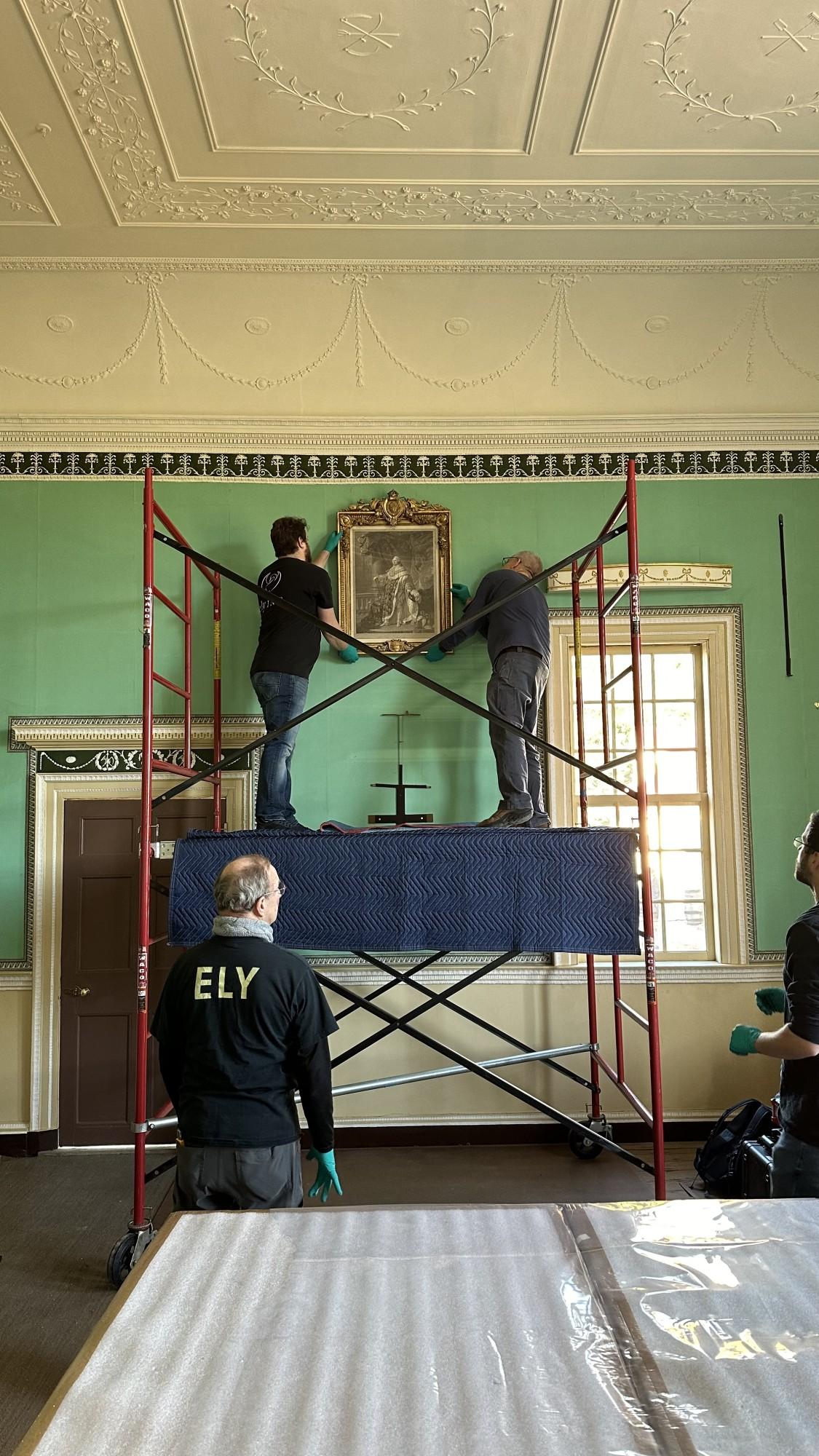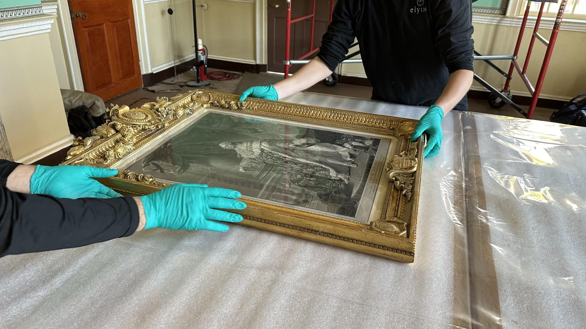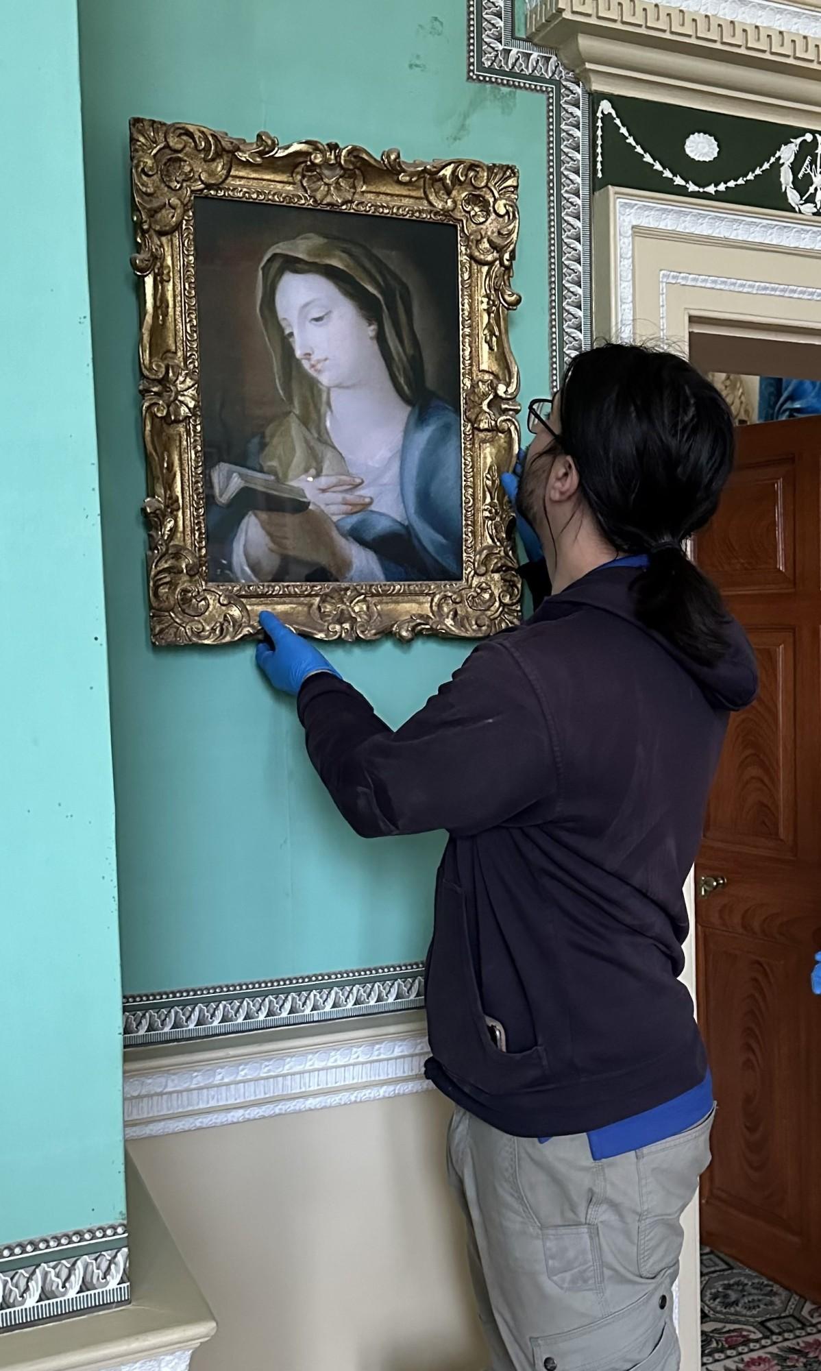 An exciting outcome of the de-installation is that it provided an opportunity for four of the New Room’s paintings, all owned by Washington, to undergo conservation. This process involves the careful examination, preservation, and restoration of paintings to maintain their aesthetic and structural integrity. Mount Vernon enlisted the services of two professional painting conservators to ensure the long-term stability of these Washington artifacts.