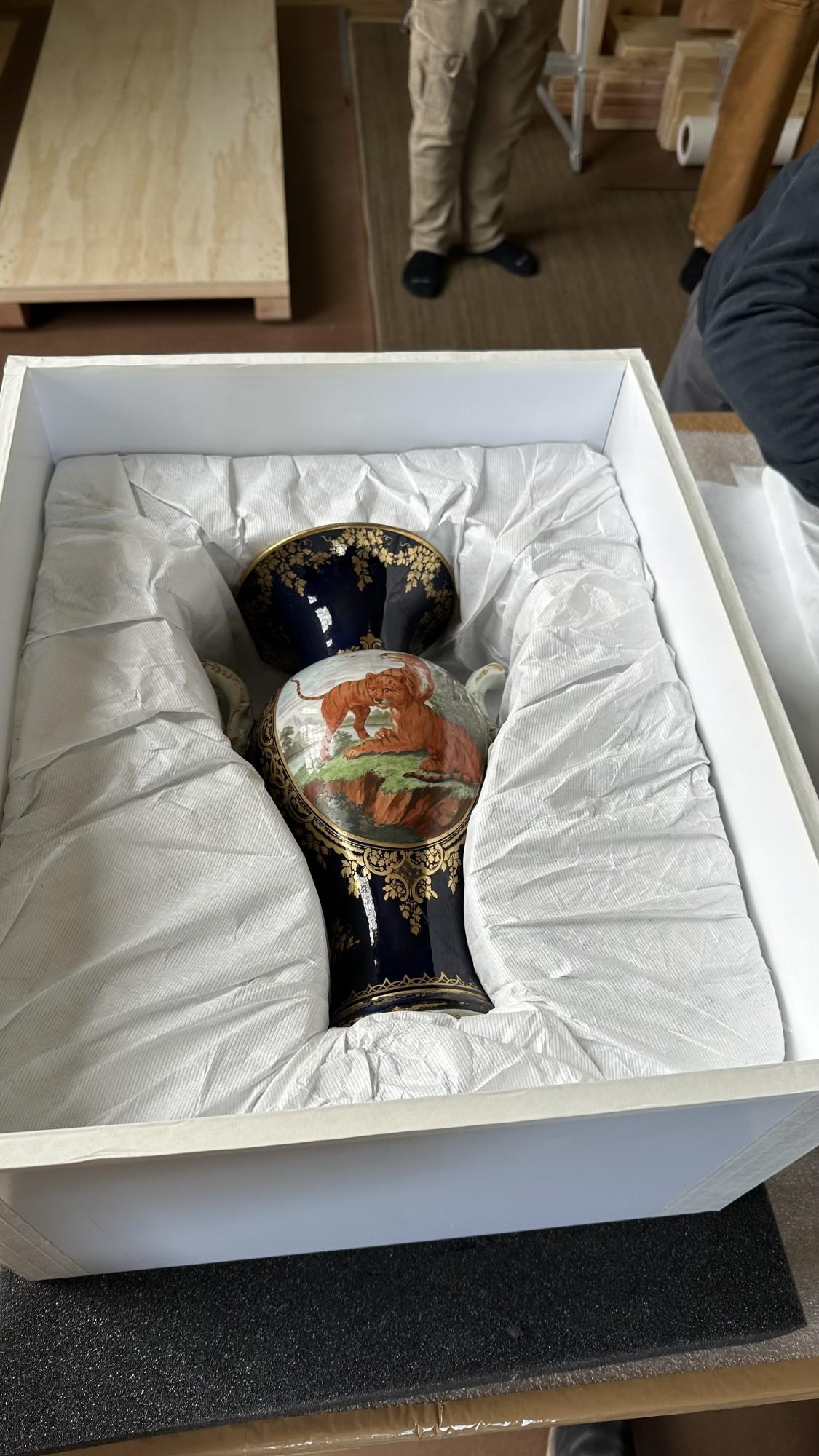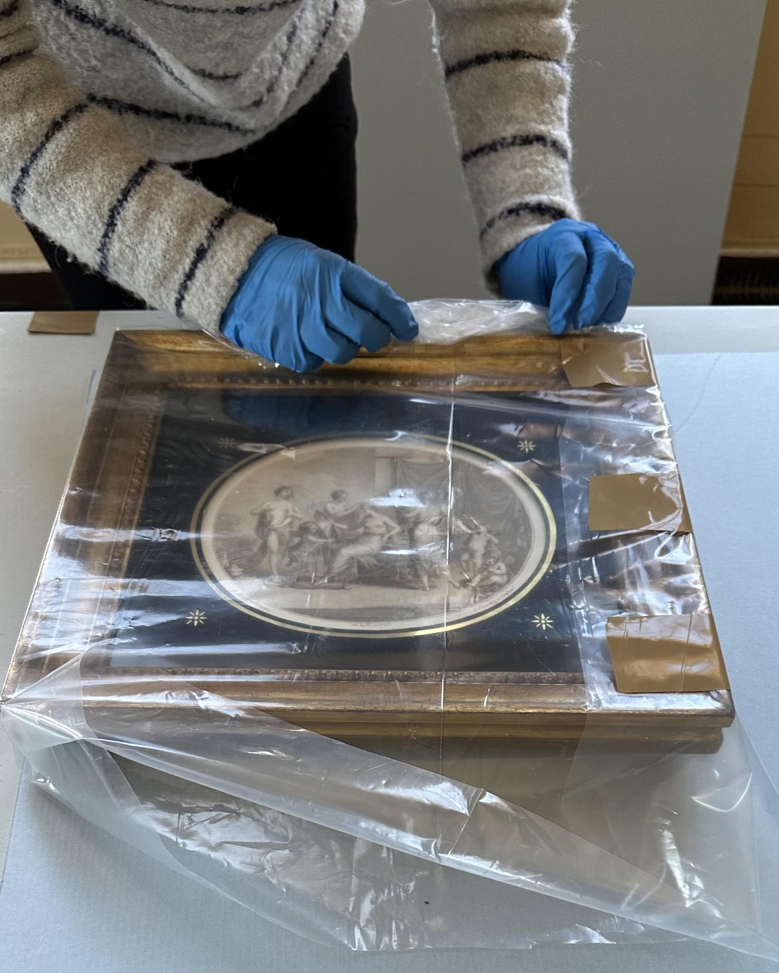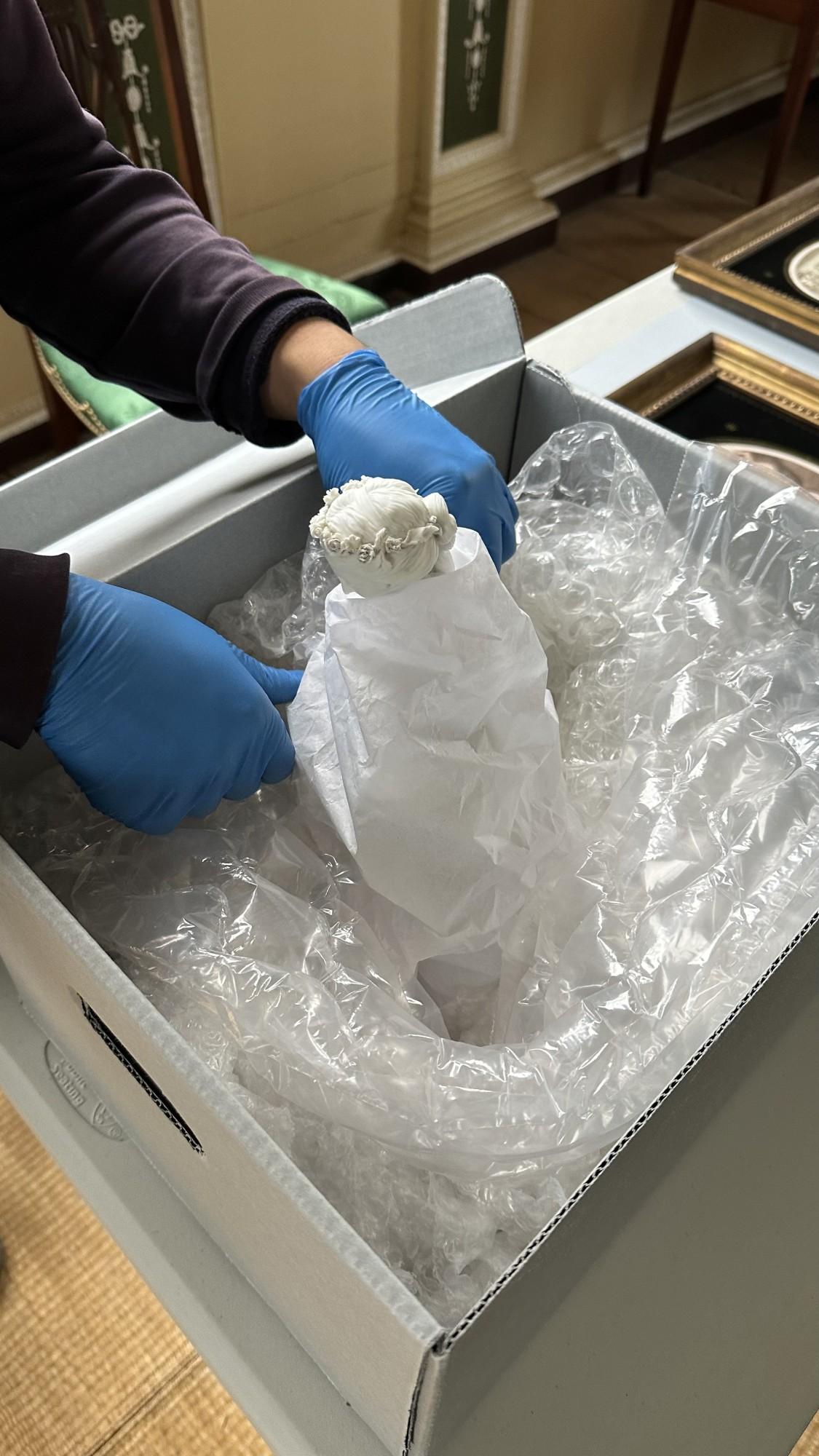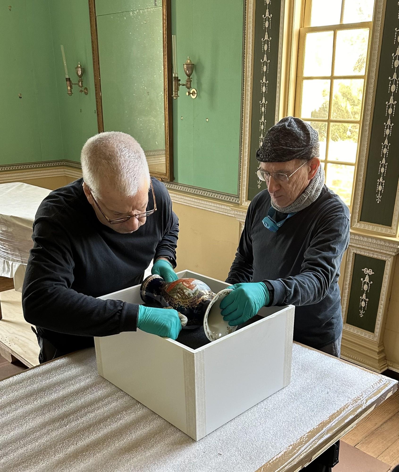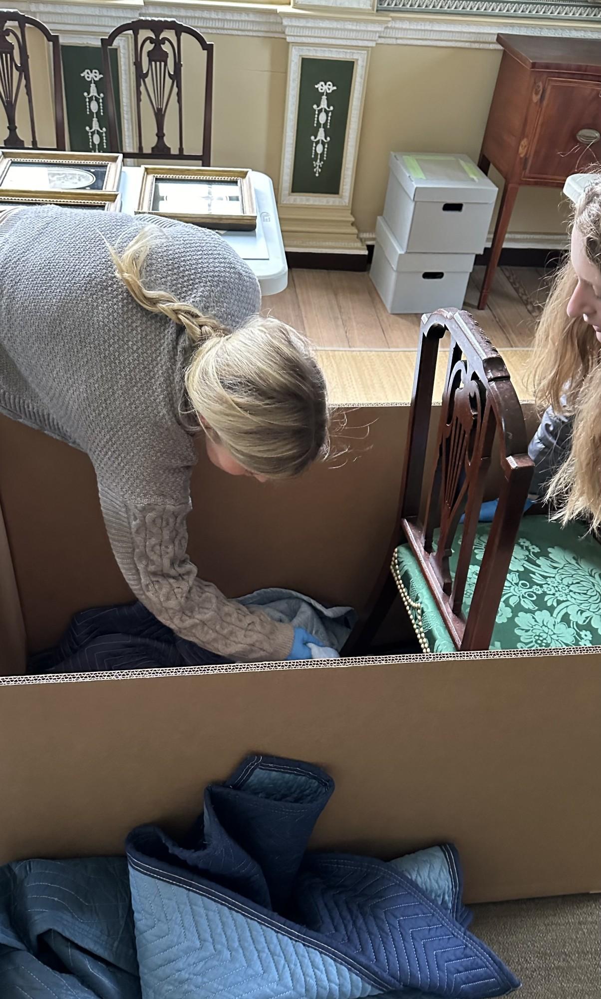 Working in their socks (to protect the floors), the Collections management team began early each morning, before the day’s first guests arrived at Mount Vernon. Beginning with the New Room’s smaller objects—such as the knife cases, bisque figures, chairs, and small prints—the team of seven handled and packed each object based on its specific needs.
